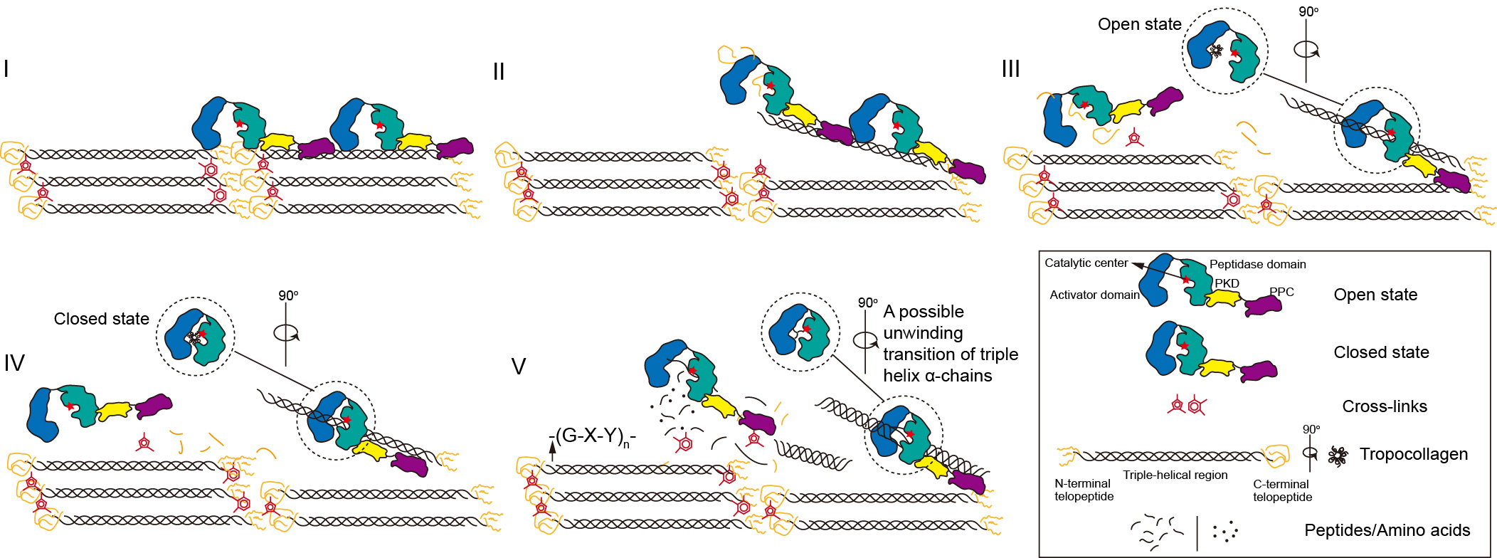 Collagenases that hydrolyze the triple-helical region of collagen under physiological context are found in animals and microorganisms. Vibrio collagenase is closely related to Vibrio pathogenesis for its role in native collagen degradation during host invasion, and is regarded as a virulence factor. However, information on the three-dimensional structure and the collagenolytic mechanism of Vibrio collagenase is still lacking. The aim of our study is to solve the structure of Vibrio collagenase and reveal its collagenolytic mechanism.