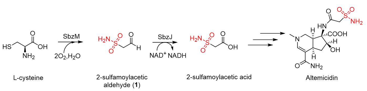 Previously our group reported the biosynthesis of a sulfonamide antibiotic natural product altemicidin4,5. In the biosynthesis of altemicidin we found that one cupin superfamily enzyme SbzM is responsible for the formation of sulfonamide moiety of altemicidin: SbzM catalyzed the conversion of L-cysteine (L-Cys) into 2-sulfamoylacetic aldehyde (1), which is further oxidized to 2-sulfamoylacetic acid by the aldehyde dehydrogenase SbzJ (Figure 1). However, the structural basis and the catalytic mechanism of SbzM remains unknown. In this study, we further investigated SbzM via biochemical, spectroscopic and computational studies.