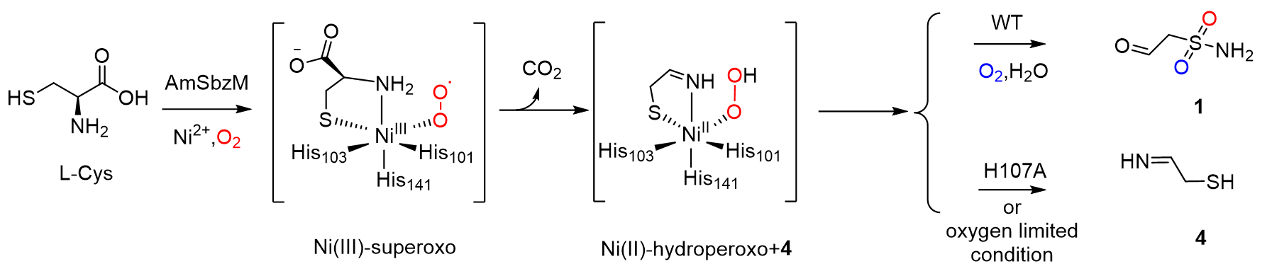 Based on all the experimental evidence we have found, we proposed a brief catalytic mechanism of AmSbzM (Figure 3): the first molecular oxygen binds to Ni(II), generating a Ni(III)-superoxo species. This Ni(III)-superoxo species induces a radical decarboxylation of L-Cys, leading to the formation of 4 and Ni(II)-peroxo. In the reaction of AmSbzM wild type under general condition, the second oxygen goes into the pocket, catalyzing the formation of final product 1, while in the oxygen limited condition or in the H107A variant’s reaction, the reaction stop because the second oxygen is hard to bind to the pocket and 4 releases to the solvent. With detailed QM/MM calculations we finally proposed a detailed catalytic mechanism of AmSbzM.