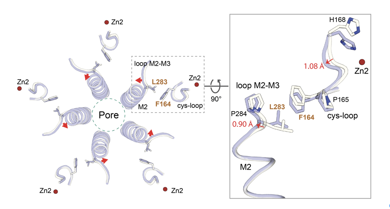 The structure revealed that hZAC exhibits homo-pentameric assembly across different states, with the cationic pore located at the center of the channel. hZAC is notably distinct from the other four receptors in the same family (nAChR, 5-HT3R, GABAAR, GlyR) and demonstrates several novel structural and functional characteristics: (1) it possesses a unique C-terminal tail (C-tail), which occupies the classical orthosteric binding site for neurotransmitter small molecules (loop C) in other mammalian CLRs and forms disulfide bonds with the M2-M3 loop in the transmembrane helical domain (TMD); (2) hZAC has a biological function of self-inhibition mediated by its C-tail; (3) hZAC is the first mammalian CLR found to use the Cys-loop as an orthosteric ligand-binding site; (4) no classical activation conformational pathways observed in other CLR family members were identified. Instead, the binding of Zn²⁺ directly triggers a conformational transition in the Cys-loop, and hydrophobic interactions between residues F164 and L283 induce movement in the M2-M3 loop, opening the channel gate.