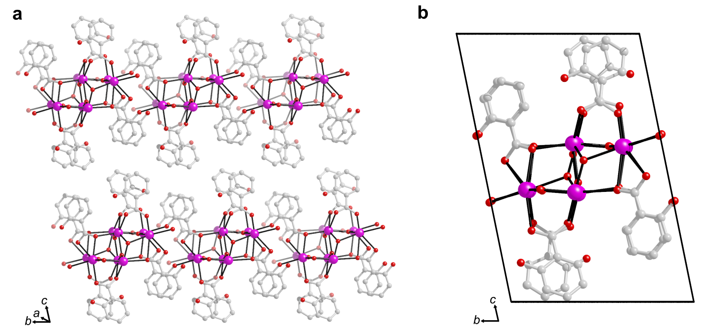 Figure 2. a Crystal structure of bismuth subsalicylate (BSS) as determined by electron diffraction. b A unit cell of the BSS structure. Hydrogen atoms are omitted. Bismuth, oxygen and carbon atoms are coloured pink, red and grey respectively.