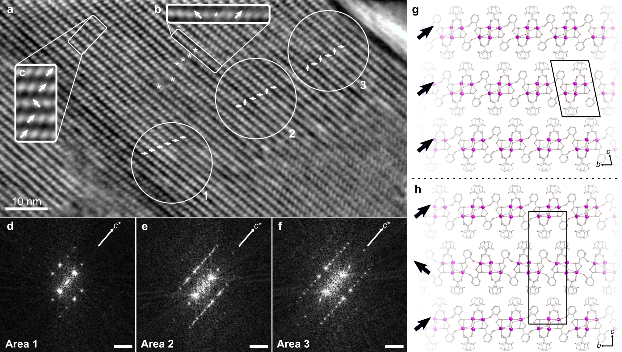 Figure 3. a Integrated Differential Phase Contrast (iDPC) scanning transmission electron microscopy (STEM) image of a bismuth subsalicylate (BSS) crystal. The inorganic building unit (IBU) made of bismuth and oxygen ions is visible as white spots and arrows are drawn in to indicate the orientation of the IBUs. Area 1 is a region with regular stacking of the IBUs, area 2 is a region with disordered stacking of the layers, and area 3 is a region with alternating stacking of the layers. b-c magnified regions of the crystal with disorder in the orientation of the IBUs in the layers. d-f Fourier transforms of areas 1-3. g The structure of BSS with a regular stacking of the layers as seen in area 1. h A structure model of BSS with alternating stacking orientations of the layers as seen in area 3.