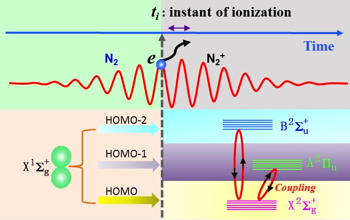 Fig.1. Transient ionization of nitrogen molecule during the laser pulse creates the ion in different states by removing electrons from the respective molecular orbitals, which are subjected to the immediate polarization by and continuous interaction with the laser field.