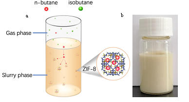 Metal-organic frameworks (MOFs) are an emerging class of three-dimensional porous materials, formed by self-assembly of metal atoms and organic ligands. The tunability of the structure and pore size of MOFs makes them promising candidates for gas separation1. Since the invention of the first MOF material, MOF-1, in 1995, there have been tens of thousands of MOFs reported. However, to the best of our knowledge, none of them has achieved commercial application. The primary reason is that the productions of MOFs in large scale are very difficult and expensive. Some characteristics of MOFs also make it difficult to use them industrially. For example, the chemical stabilities of some MOFs are low. Additionally, most synthesized MOFs are in the form of fine power, so they must be further processed before being used as absorbents in traditional pressure swing adsorption or temperature swing adsorption process. Frankly, compared with the efforts made on synthesizing new MOFs with higher and higher performances, those on the using techniques of them are scarce. Chen’s group is one of few teams working on industrial application technology of MOFs. Their works focus on the application of one most maturely studied MOF, ZIF-8. They proposed a kind of slurry sorption technology in which ZIF-8 powder as synthesized was directly mixed with suitable solvent to form flowable slurry and then used as absorbent for gas separation2, 3. They also invented method to produce ZIF-8 economically in large scale4, 5. In present work, they developed a novel ZIF-8 slurry, as shown in Fig. 1, suitable for the high efficient separation butane isomers, which has been considered to be very important and full of challenge in petrochemical industry. More encouragingly, they established a pilot industrial apparatus, as shown in Fig. 2, for separation of butane isomers and carried out pilot test. It is a critical step approaching the commercial application of MOFs.