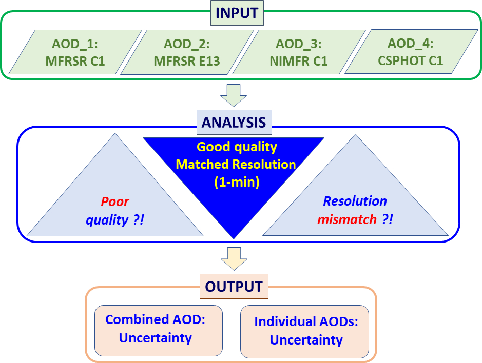 Aerosol optical depth (AOD) is a measure of how much aerosol particles prevent direct sunlight from reaching the ground. AOD records with different accuracies and temporal resolutions are typically provided by several instruments that vary in their design. Combining these records into a single data product can give AOD data with excellent time continuity compared with measurements from a single instrument. Our work demonstrates how to straightforwardly obtain the combined AOD and its uncertainty using an intuitively understandable approach (Figure 1) that addresses: (1) the varying data quality and resolutions of individual AOD records and (2) the uncertainty of the merged AOD data and its relevance for users.
