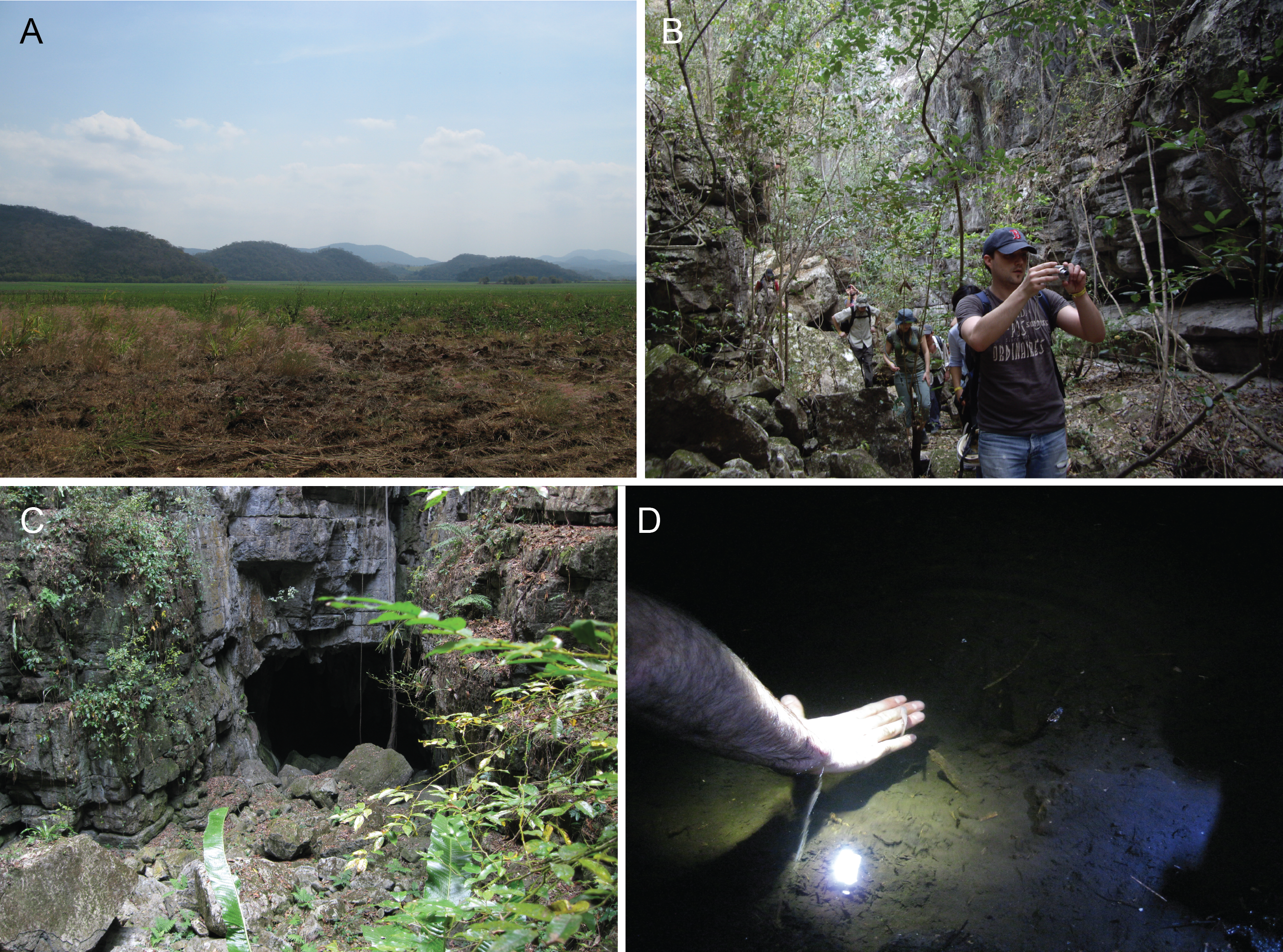 Figure 1. On the way to the Tinaja cave in Mexico. A) The Sierra de El Abra region in Central Mexico. B) A canyon through the subtropical jungle leads the way to the Tinaja cave entrance (C). D) A hungry Tinaja cavefish enjoyed a nibble on the hand of the researcher. (credit: Nicolas Rohner)