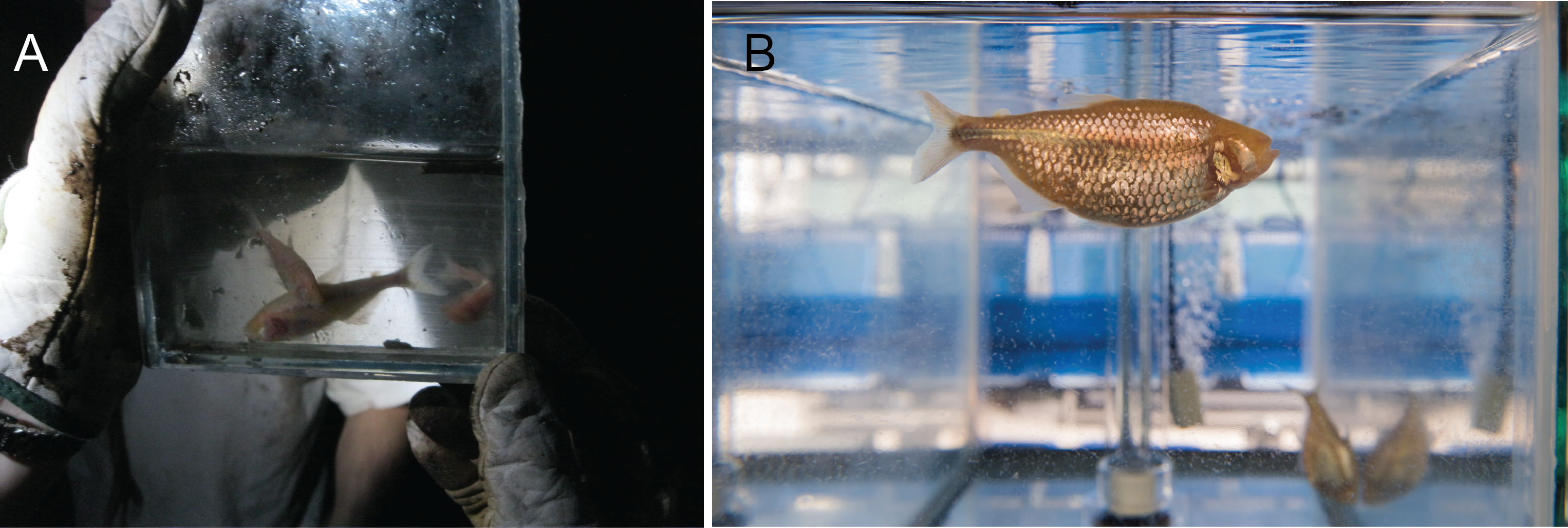 Figure 2: Thin or Big? Tinaja cavefish in the midst of the dry season (A) are much skinnier than when fed every day in a lab environment (B). (credit: Nicolas Rohner; Stowers Institute for Medical Research)