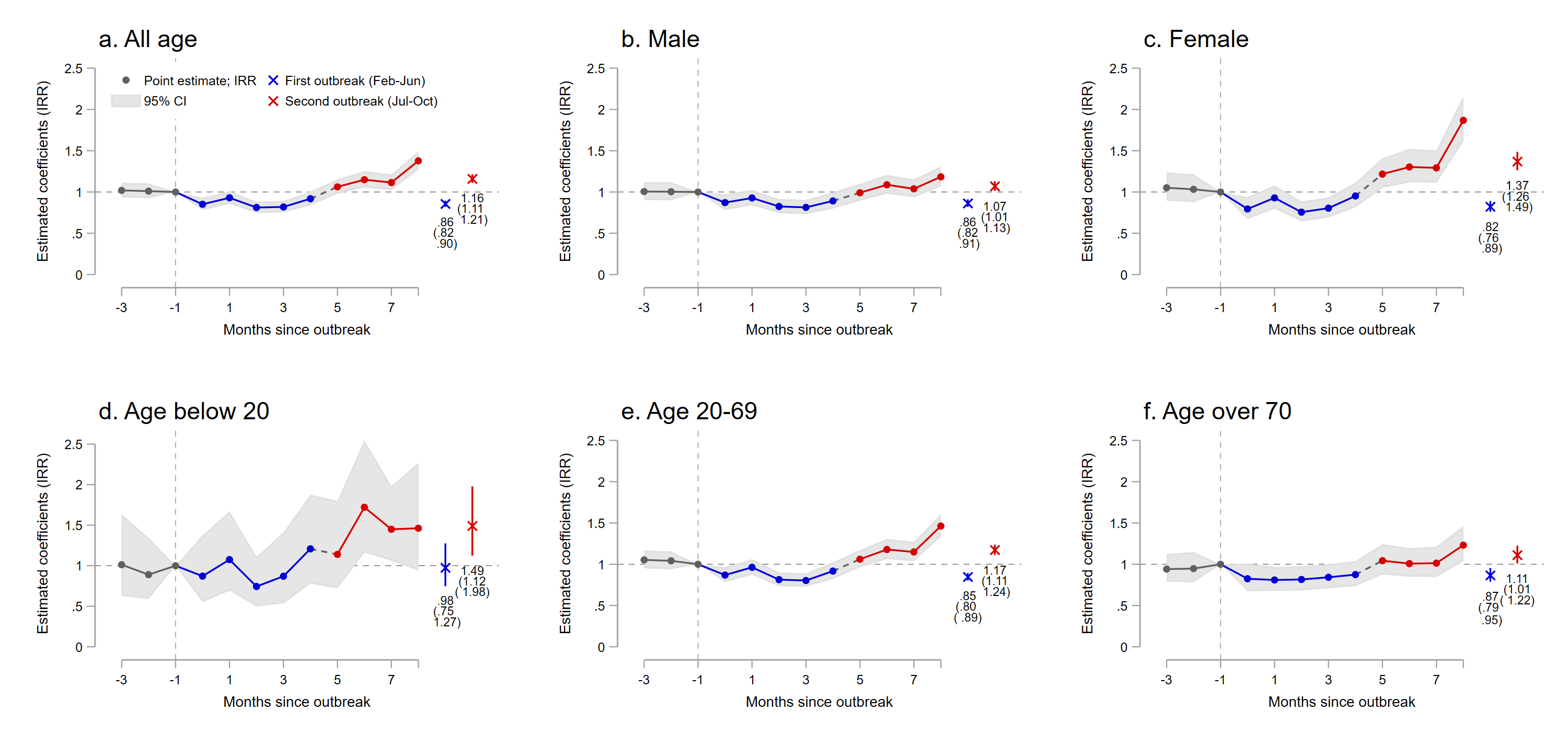 Lastly, we find that the effects of the pandemic are not evenly distributed across populations. From July to October 2020,  the increase in the suicide rate among females (37%) and children and adolescents (49%) were much greater than males (7%). This may be because the pandemic excessively affects female-dominant industries and younger workers, who tend to be low-skilled and non-regular workers.  An increase in women’s burdens on childbearing and domestic violence and the stress from unordinary school circumstances could be other factors driving the results.