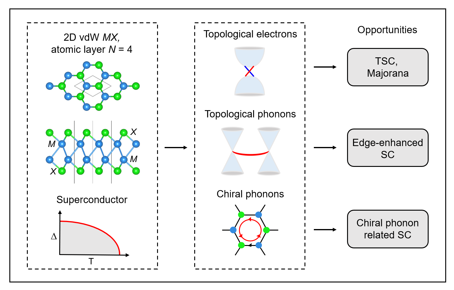 Our results provide opportunities for the interplay between 2D SC and topological electrons/phonons & chiral phonons in a single material platform. The proposed MX family with N = 4 may become a rising class of vdW materials, deserving the attention from experimentalists.