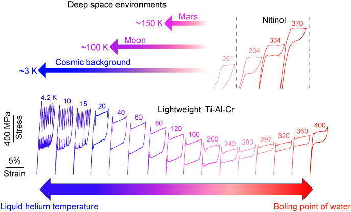 The development and application of metallic materials have shaped human society since the dawn of civilization. Archaeologists have divided prehistoric ages into periods based on the adoption of bronze and iron. Conventional metallic materials, such as steel, are strong, durable, and hard compared to polymers. However, higher strength typically comes at the cost of flexibility, making metallic materials prone to permanent deformation under large strains. Overcoming this intrinsic trade-off, shape-memory alloys exhibit polymer-like large recoverable strain while maintaining characteristic metallic properties. This large recoverable strain, called superelasticity, resembles elastic deformation macroscopically but occurs through reversible phase transformations at the atomic scale. Shape-memory alloys, such as the well-known nitinol, are extremely useful in medical, robotics, architectural, and aerospace applications. However, these alloys typically show superelasticity only within a narrow temperature range. We have reported a superelastic titanium-aluminum-based (Ti-Al-Cr, Figure 1) shape-memory alloy that functions over a wide temperature range, from liquid helium temperature to above the boiling point of water, while combining high strength and lightweight properties.