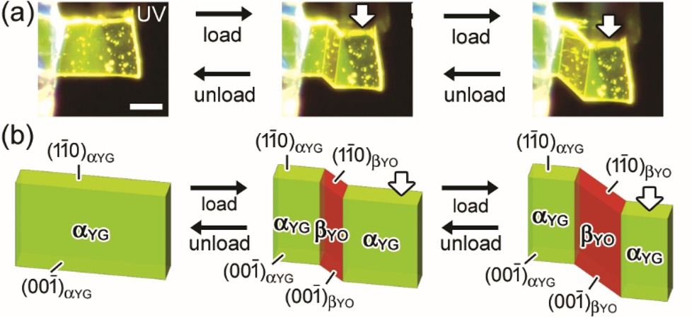 The mechanical loading on a crystal YG generates orange luminescent phase (O) in the middle, which is gradually enlarged by further mechanical loading (Figure 3(a)). Then, subsequent unloading the mechanical force results in complete recovery of YG crystalline phase.