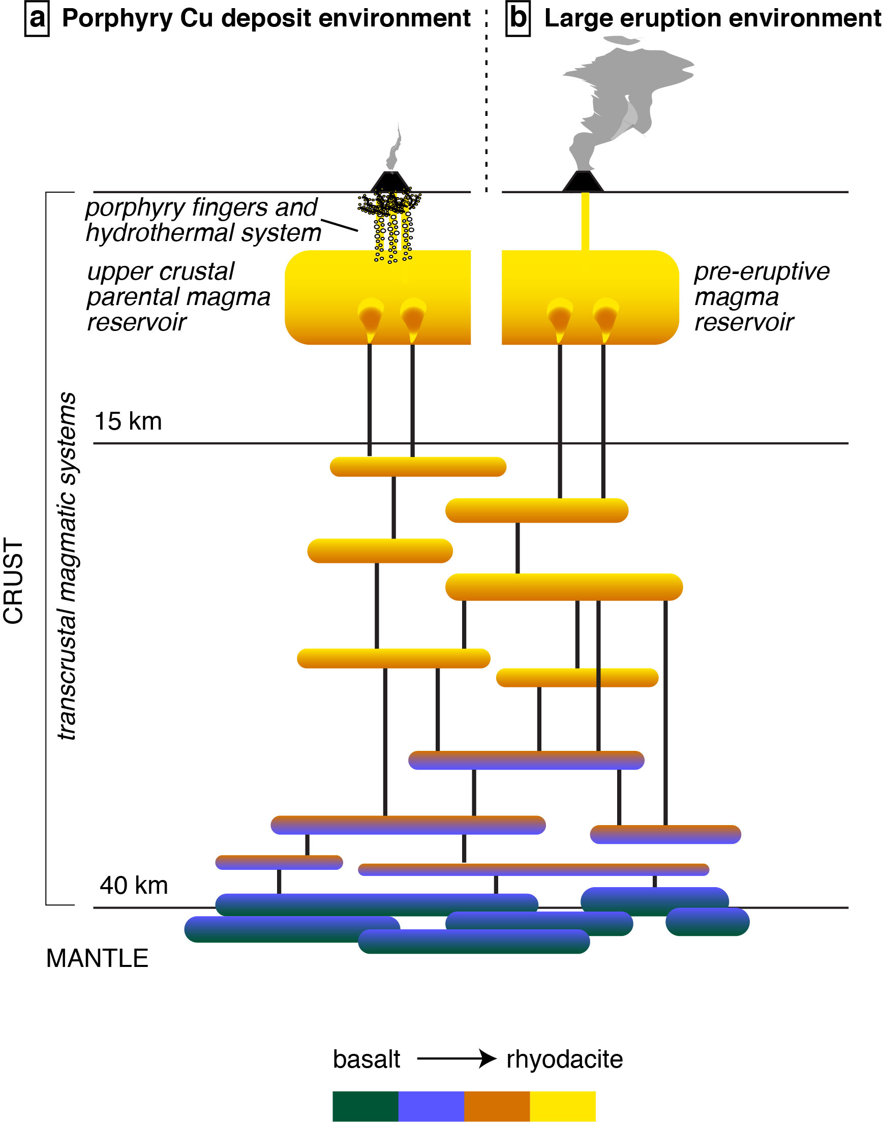 Precipitation efficiency is considered to be broadly similar in porphyry copper deposits. Also copper contents of magmatic fluids vary within a relatively narrow range, based on measurements of natural fluids and laboratory experiments. This has brought us to quantify the link between potential copper endowment of a porphyry copper deposit and amount of fluid that has precipitated copper in the deposit. The amount of such fluid, in turn, depends on the amount of magma that ultimately releases the fluid. Using this rationale, we calculated that supergiant porphyry copper deposits, containing at least 10 Mt Cu and up to >100 Mt Cu, require an amount of magma that is at least ~500 km3 and up to >2500 km3. Previous studies suggest that these magma volumes, which are similar to those erupted catastrophically during large eruptions, can only accumulate in large regions of the lower continental crust at depths of a few tens of km. However, at these depths, magmas cannot exsolve an aqueous fluid, which is a necessary step to form porphyry copper deposits, as mentioned above. This is because, like carbon dioxide in sparkling water, also the solubility of water in magma strongly increases with pressure, i.e., with depth in the crust. In order to release its fluid cargo, the magma accumulated in the deep crust needs to ascend to shallower levels. Here, water solubility decreases and the fluid is liberated together with copper, because the latter preferentially goes into the fluid phase rather than remaining in the silicate melt. The transfer of magma from the deep to the shallower crust, where porphyry copper deposits form, occurs through a transcrustal magmatic system (Figure 3) within timescales that are constrained by the duration of the process of fluid exsolution and metal precipitation. Such timescales can be precisely measured using natural radioactive decay of U and Re in two minerals associated with the formation of porphyry copper deposits, zircon (ZrSiO4) and molybdenite (MoS2) respectively. We have calculated the rate of magma transfer from the deep to the shallower crust, which can be expressed as km3 of magma transferred in a year, and realized that these transfer rates were very high and similar to those usually leading to large eruptions. This was unexpected because, as it can be inferred intuitively, an eruption, especially a large one, will destroy the porphyry deposit situated between the shallow magma reservoir and the volcano (Figure 3). On the other hand, this conclusion suggests that there are peculiar conditions for which high-rate magma injection beneath a volcano may lead to the growth of a large magma reservoir without a catastrophic eruption, allowing a "quiet" release of copper-bearing fluids. The main conclusion of our work is that magmatic systems leading to the formation of either porphyry copper deposits or catastrophic large eruptions, are, ultimately, very, albeit not entirely, similar (compare panels a and b in Figure 3). This finding opens new avenues in the development of geological, mineralogical, and geochemical tools for the successful exploration of the largest porphyry copper deposits on Earth.