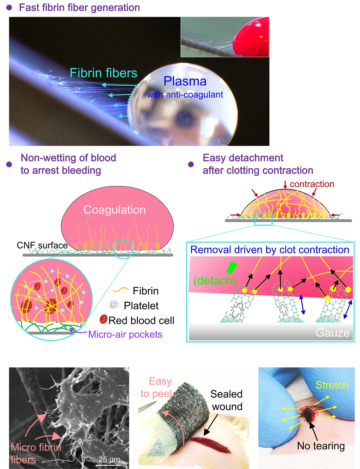 This discovery was partially coincidental. We were initially looking for materials that are hemo-compatible, and wanted to reduce thrombosis by reducing the blood flow stresses by nanoengineering appropriate surfaces. Instead, we observed that this nano-structured surface generated abundantly and rapidly fibrin when in contact with blood enabling fast clotting. We then realized that this material would be an excellent candidate for hemostasis. Out of curiosity, we investigated its capabilities for hemostatic application, and were surprised by how well it worked for this purpose, even in the in vivo animal experiment.