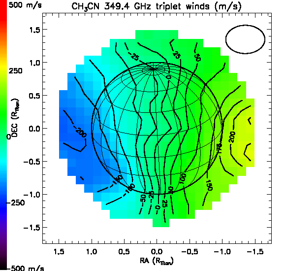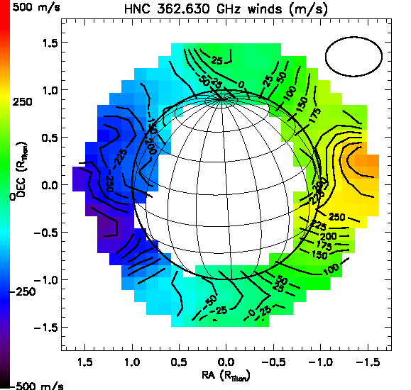 Cassini could not do it, but ALMA did. Titan’s submm spectrum is the richest among all planetary atmospheres, and the relatively large apparent size of Titan (~1 arcsec, including the atmosphere) makes it possible to comfortably resolve the disk, isolate the limb emission, while keeping sufficient signal-to-noise to discern Doppler winds. We used ALMA in 2016 in this manner and obtained wind maps in Titan in no less that 6 different species : HCN, DCN, CH3CN, CH3CCH, HC3N and HNC. All the wind maps indicated strong (250-350 m/s) blueshifts on Titan’s east limb, and corresponding redshifts on the west limb, demonstrating a primarily zonal circulation, but with different detailed structure from molecule to molecule. For example, the two maps below refer to CH3CN and HNC. Look how wind fields at different. In CH3CN we see an hemispheric assymetry, with winds stronger in the south (winter) than in the north (summer). In HNC, we see mostly a very strong equatorial jet with speed of almost 350 m/s, i.e. 40 % higher than the speed of sound !