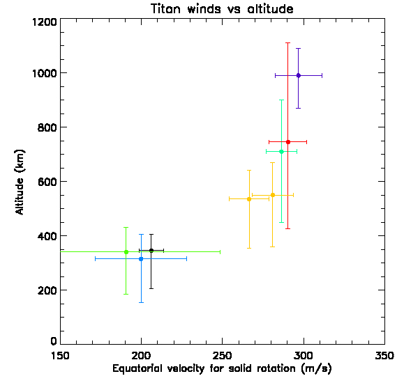It turned out that at that same conference I had a talk on Titan winds, presenting material that would ultimately make the paper presently published in Nature Astronomy. For Titan and its 1.5 bar N2 atmosphere, the question was not « how deep do winds extent ? », but rather « how high do winds extent in this ~1500 km thick atmosphere? » The wind structure in Titan’s lower and middle atmosphere is relatively well characterized. Back in 2005, the Huygens Probe had measured the speed and direction of winds from 150 km down to the surface during its descent across Titan’s atmosphere, and over 2004-2017, the Cassini Composite Infrared Spectrometer CIRS provided extensive fields of temperatures over ~100-500 km altitude, from which winds can also be deduced (under some assumptions).