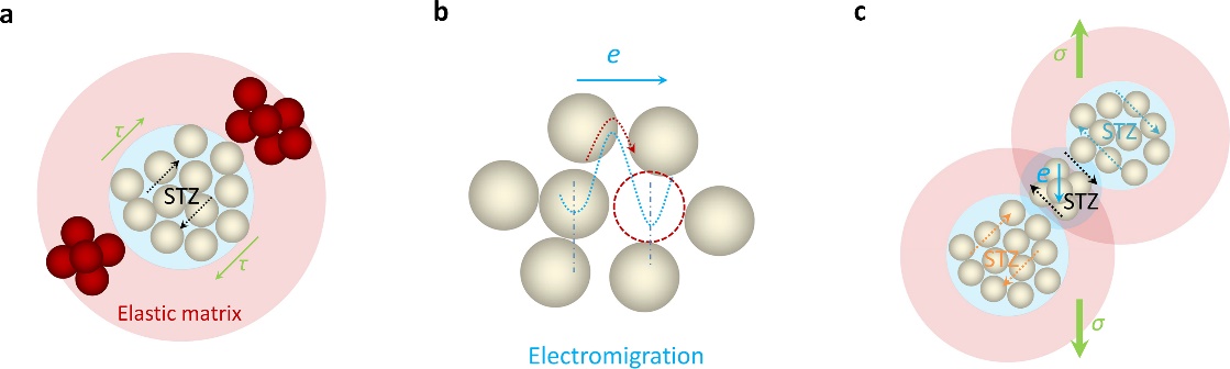 Several years ago, we noted the electromigration effect, i.e. when an electric current passes through a conductor, the electrons scattered by the conductor atoms promote atomic diffusion in the direction of electron transport via what is called as the electron scattering force, as illustrated in Fig. 1b. This enhanced atomic diffusion under current charge2 functions analogously to the classical free volume-based flow mechanism in BMGs3. More importantly, it was found that geometrically constrained atoms experience greater electron scattering force than more freely diffusing atoms4. This result predicts that the atomic diffusion in the elastic matrix of STZ would be preferentially promoted by the electron scattering force. With the elastic matrix motivated by electromigration, the long-range interactions between STZs would be relaxed and the self-assembly of STZs1 into shear bands will be suppressed. As a result, BMGs, aided with electromigration, will exhibit homogeneous plastic deformation, as illustrated in Fig. 1c, even in the temperature-strain rate map where the inhomogeneous regime dominates, i.e, the electromigration expends the regime of homogenous plastic deformation