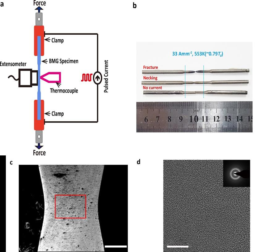 Fig. 2 Tensile test under a pulsed electric current. (a) The scheme of tensile test; (b) BMG specimens after tensile tests; (c) Closeup on the necking region, indicating no sign of shear banding in the BMG specimen tested. (d) High resolution TEM images of the atoms in the necking region of the tensile-tested BMG specimen.