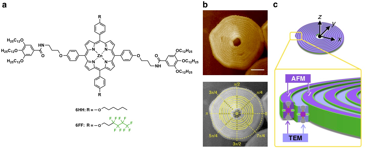With this in mind, we synthesized a new porphyrin monomer bearing fluorinated side chains (6FF in Fig. 1a). Actually, we were still ‘expecting’ that 6FF would form a supramolecular nanosheet, similar to that of 6HH, but with a distinct aspect ratio. Norihiko performed the usual AFM measurements on the self-assembled structure of 6FF; much to our surprise he observed a one-dimensional supramolecular polymer which coiled into Archimedean spiral to form a circular nanosheet (Fig. 1b). I would say that this was what we had “expected”, in a sense that he indeed obtained supramolecular nanosheets with a distinct aspect ratio (or circularity) of 1; however, it was achieved in a completely unexpected way. What Professor Itoh said was true!