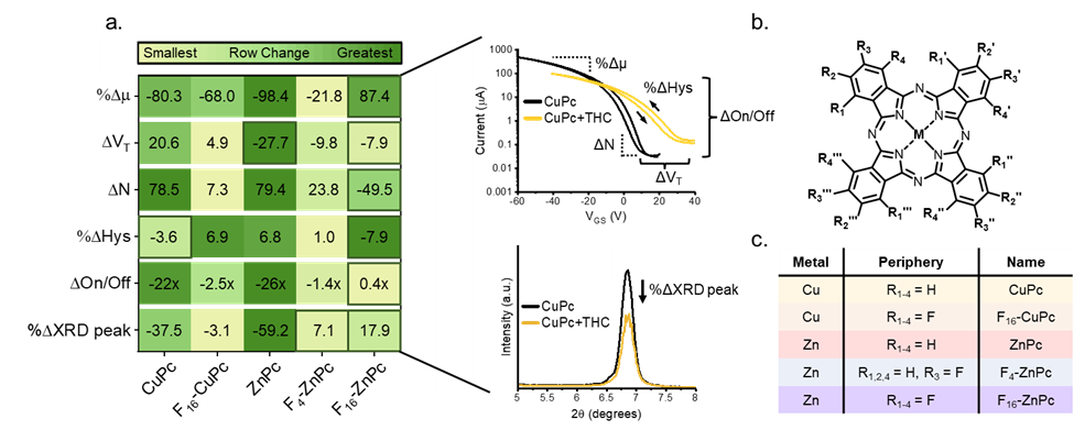An advantage of Pcs as a semiconducting sensor layer is the ease by which modifications can be made to the central metal (Figure 1) which allows tuning of the electronic, colorimetric, and sensor properties. Thus, we began by examining the OTFT-sensitivity of a series of copper (Cu) and zinc (Zn) Pcs with varied degrees of peripheral fluorination, and by extracting electronic characteristics from the transfer curves, established ZnPc as the most THC-sensitive material.
