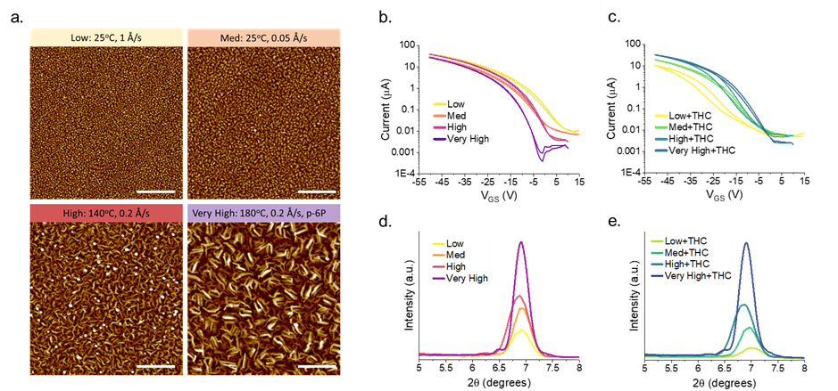 Figure 2. Effect of surface morphology on ZnPc OTFT sensitivity to THC vapor. (a) AFM images, transfer data, and XRD spectra of ZnPc OTFTs with varying degrees of crystallinity (b, d) pre- and (c, e) post- exposure to 400 ppb THC vapor over 90 seconds. Low crystallinity thin-films were deposited at a rate of 1 Å/s and 25°C, medium (med) at 0.05 Å/s and 25°C, high at 0.2 Å/s and 140°C, and very high at 0.2 Å/s and 180°C with a pre-deposited monolayer of p-sexiphenyl (p-6P). Scale bars represent 500 nm.