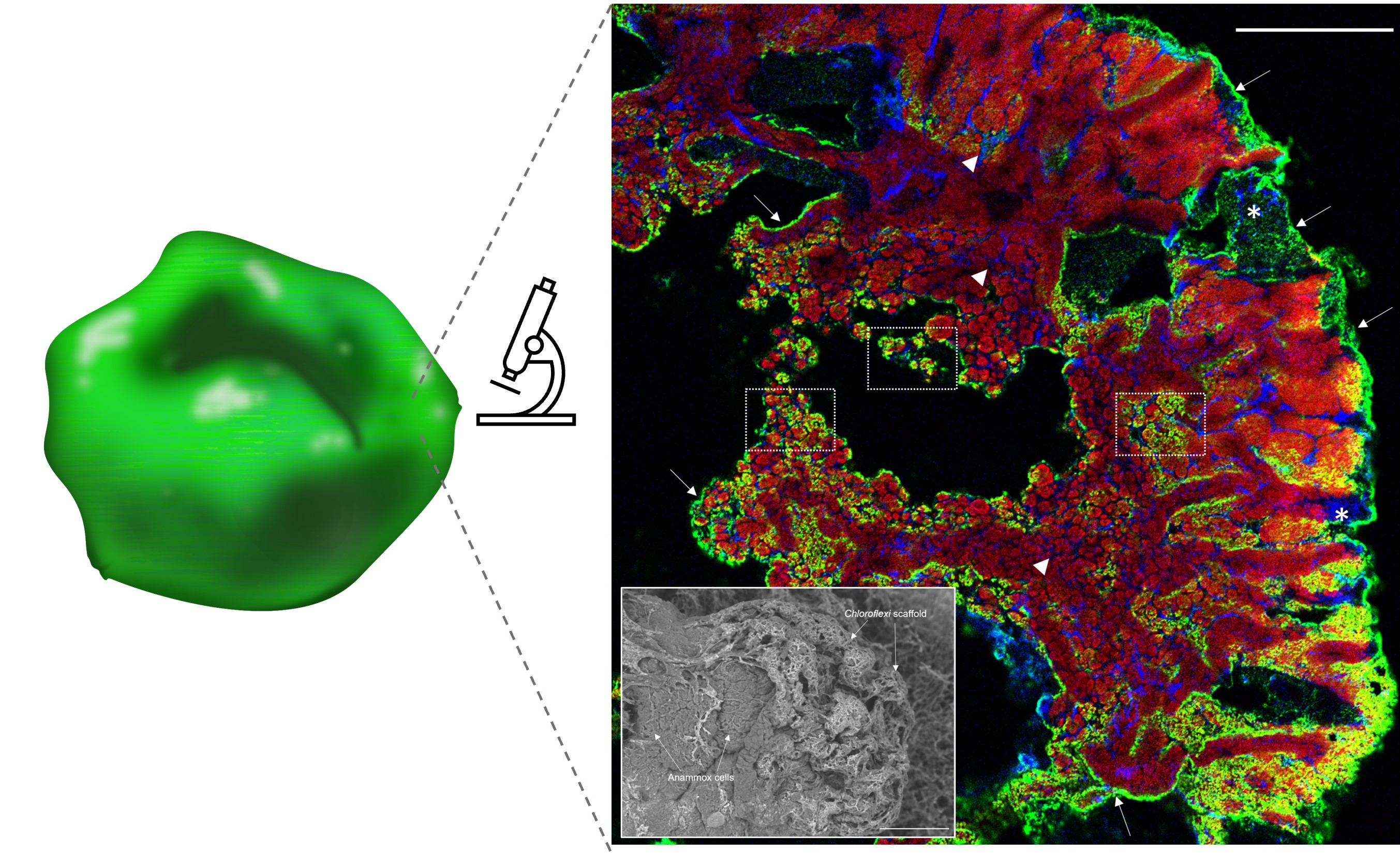 Anammox granule with S-layer protein (green) located on the cell surface (left). Confocal laser scanning micrograph (right) shows an anammox biofilm thin section with Chloroflexi (blue) demarcating anammox cell clusters (red) at the internal channels between anammox cells (arrowheads) and at the periphery of the biofilm (asterisk). The distribution of S-layer protein (green) on anammox cell cluster surfaces (white dotted box) and at the biofilm edges (white arrows) is overlaid. Scale bars indicate 20 µm. Inset: Scanning electron micrograph shows the cross-linked Chloroflexi network surrounding anammox cells of anammox granular sludge. Scale bar indicates 50 µm.