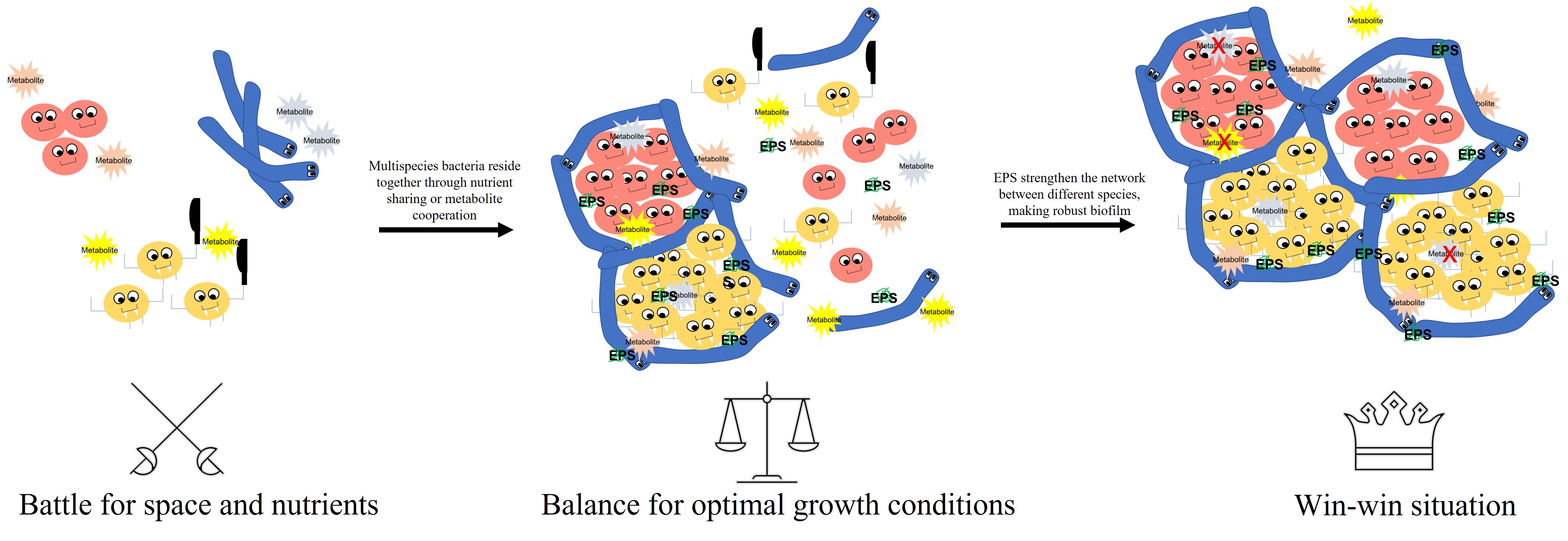 Biofilms are a collection of bacteria, existing mostly as communities of multiple species housed in a slimy extracellular polymeric matrix. Biofilms are everywhere and contribute greatly to the biotransformation of key nutrients, as seen in wastewater treatment processes. But the matrix also provides biofilm-embedded bacteria with a robust scaffold for residing in, imparting them with emergent properties such as stress resistance, e.g., enabling persistent microbial infections. The scaffold also serves to bring microorganisms together, enabling cooperation for resource cycling and sharing, and hence promote optimal fitness for all members of the community.