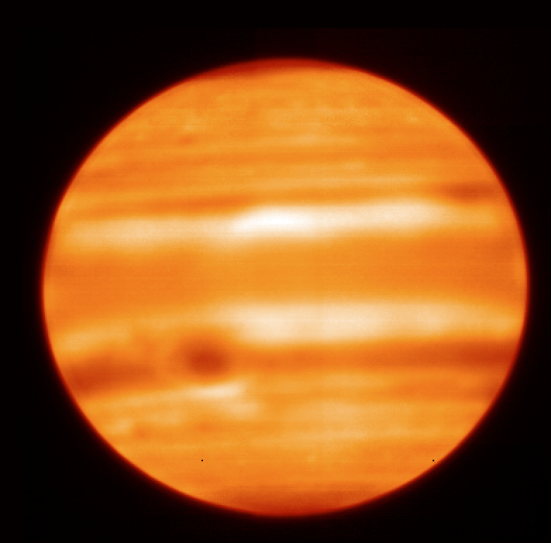 Image of Jupiter using a filter centered near 18 µm, taken by the COMICS instrument at the Subaru Telescope atop Maunakea, Hawaii, on 2019 May 27. Brighter and darker areas designate warmer and cooler regions, respectively, around 330 mbars of pressure in the upper troposphere.