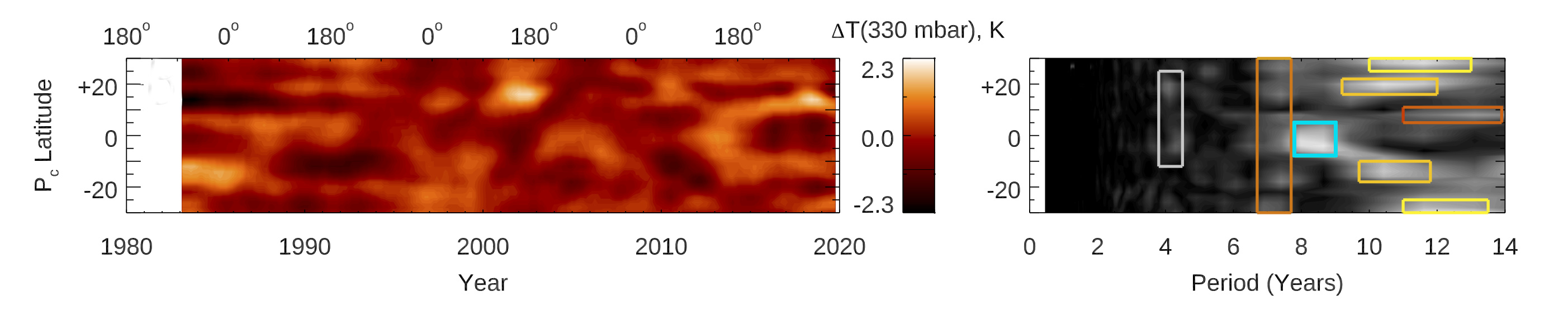Difference between the derived 330-mbar temperatures and their longitudinal mean (left) and the corresponding power spectra at each latitude, enhanced to visualize faint but important features (right). The white box bounds the latitude and period of 4.3±0.5 years, the dark orange box 7.4±0.6 years, the blue box 8.3±1.0 years. The light orange boxes identify a spread of 10.4-11.7 ±1.0 years in the north and a period of 10.5±1.0 years in the south. The yellow boxes identify a period spread of 10.3 – 11.6 ±1.5 years in the north and 11.4-13.1±1.0 years in the south. The red box identifies a broad peak period spread of 11.6-13.2 ±1.0 years. There are no significant periods longer than 14 years