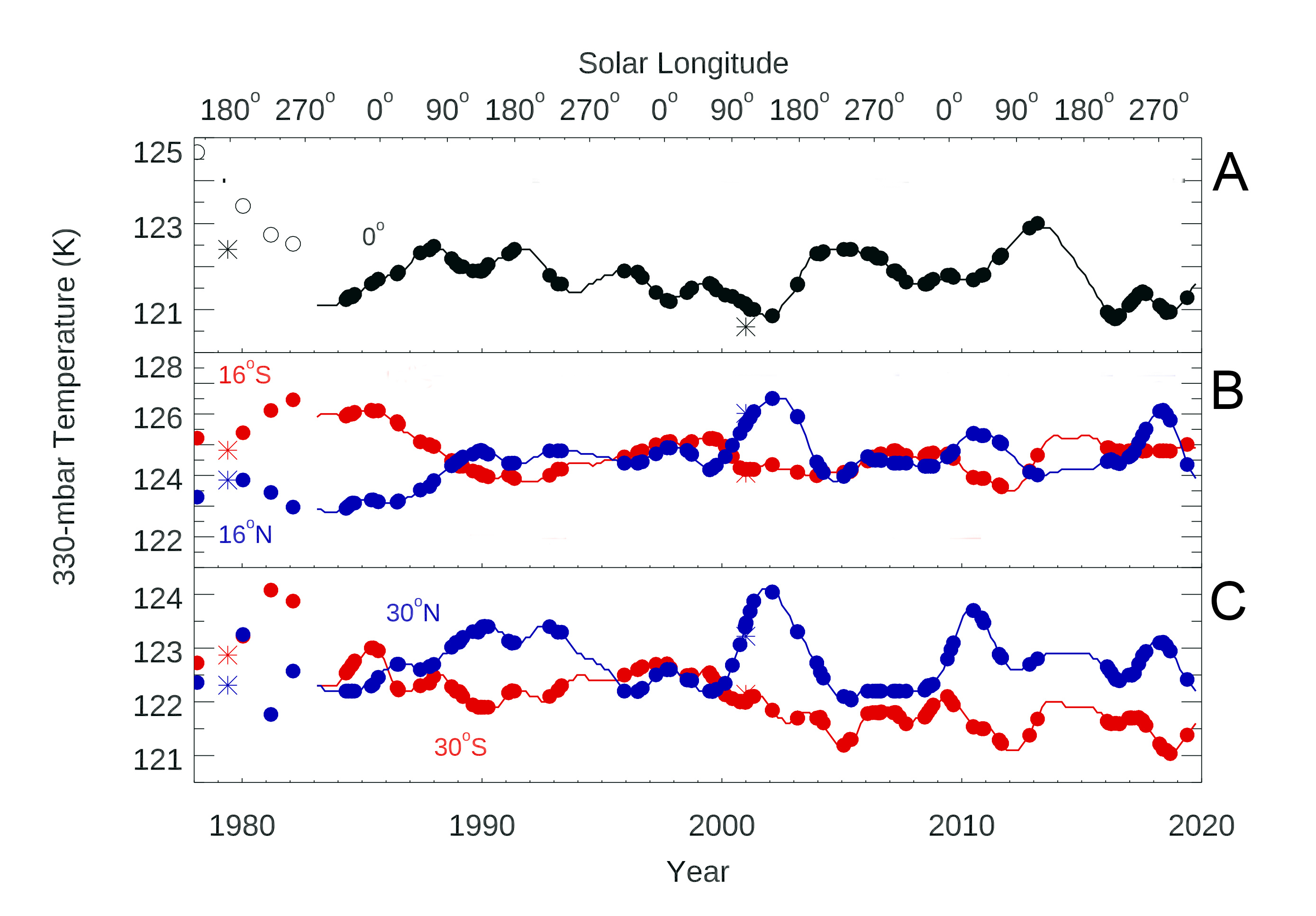 Retrieved 330-mbar temperatures (A) at the equator, (B) 16° from the equator, and (C) 30° from the equator. Filled circles show the temperatures derived at each date of measurement, and solid lines indicate temperatures retrieved. Open circles at the equator denote the poorer spatial resolution of these data. Asterisks denote corresponding 330-mbar temperature differences derived by the Voyager-1 IRIS instrument in 1978 and the Cassini CIRS instrument in 2001.