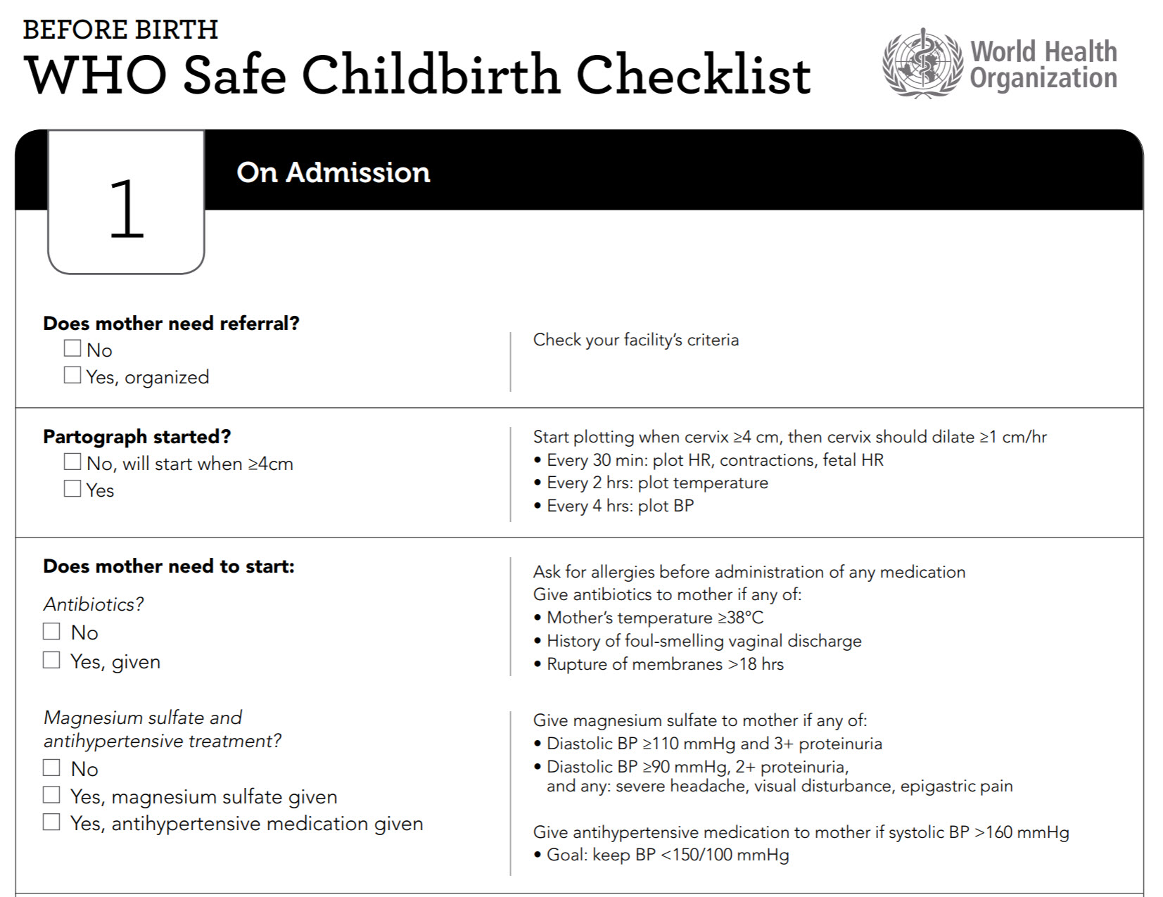 Another example is the recent large trial in India of the WHO Safe Childbirth Checklist, a quality-improvement tool (graphic below), that promotes systematic adherence to practices that have been associated with improved childbirth outcomes.