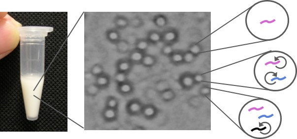 We thought we had a good chance to overcome this hurdle by expanding our previously constructed in vitro RNA self-replication system, a model system for the ancient RNA-protein world. In this system, an artificial RNA (Rep-RNA) replicates through translation of a self-encoded replication enzyme in a cell-like compartment, and parasitic RNA spontaneously appears by replication errors. It turned out, however, the expansion of the system was the most difficult part in this study. The critical step, which took more than two years, was to design another RNA that has two features: (1) the encoding of a different enzyme to establish mutualistic cooperation with Rep-RNA; and (2) the ability to be replicated by the protein replicase enzyme (cooperated by Rep-RNA). Because the replication efficiency is closely related to RNA secondary structures, we needed to modify these RNAs by incorporating mutations while maintaining the function of an encoded protein, which was the biggest constraint. The variety of possibly encoded proteins were huge, including translation proteins, nucleotide synthetases, replication-assisting factors, etc. There was no way to predict whether a designed RNA would work or not until we introduced dozens of mutations and/or evolved them by the laborious in vitro selection technique, and thus, this was tough work.
