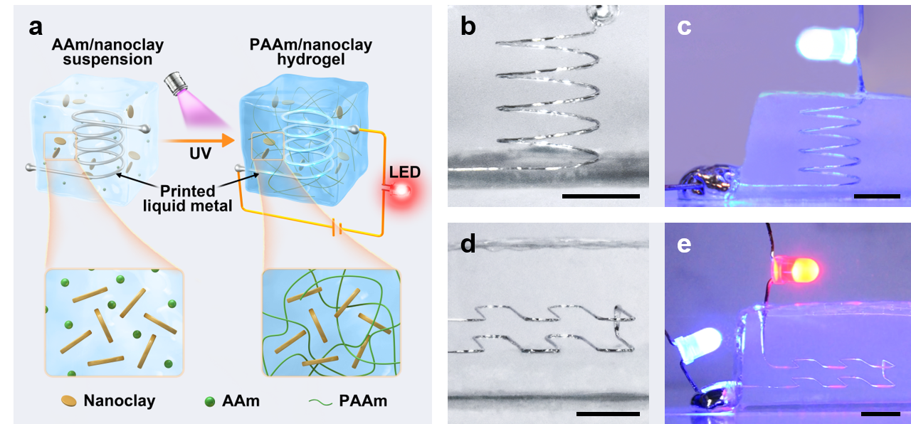 Fig. 2 Liquid metal-hydrogel electronics with printed dangling structures of liquid metal. a Schematic of AAm/nanoclay suspension polymerized into PAAm/nanoclay hydrogel under UV light after printing. b–e Printed 3D structures of liquid metal after printing and at work: (b, c) Circular helix structure. (d, e) Double-layered structure.
