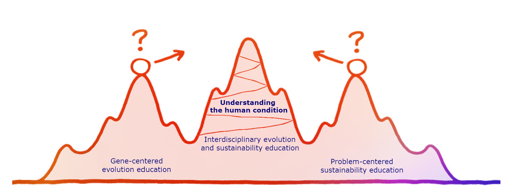 Evolution and sustainability education may seem like two disparate fields, and this notion gets reinforced when the communities behind these educational specialties each pursue separate peaks of progress. If we can pull back and see the pursuit of an understanding of the human condition that is simultaneously practical in nature, yet grounded in the best of our emerging collective factual understanding of our species' past and potential, then we can see a higher, unified peak for which we all can aim.