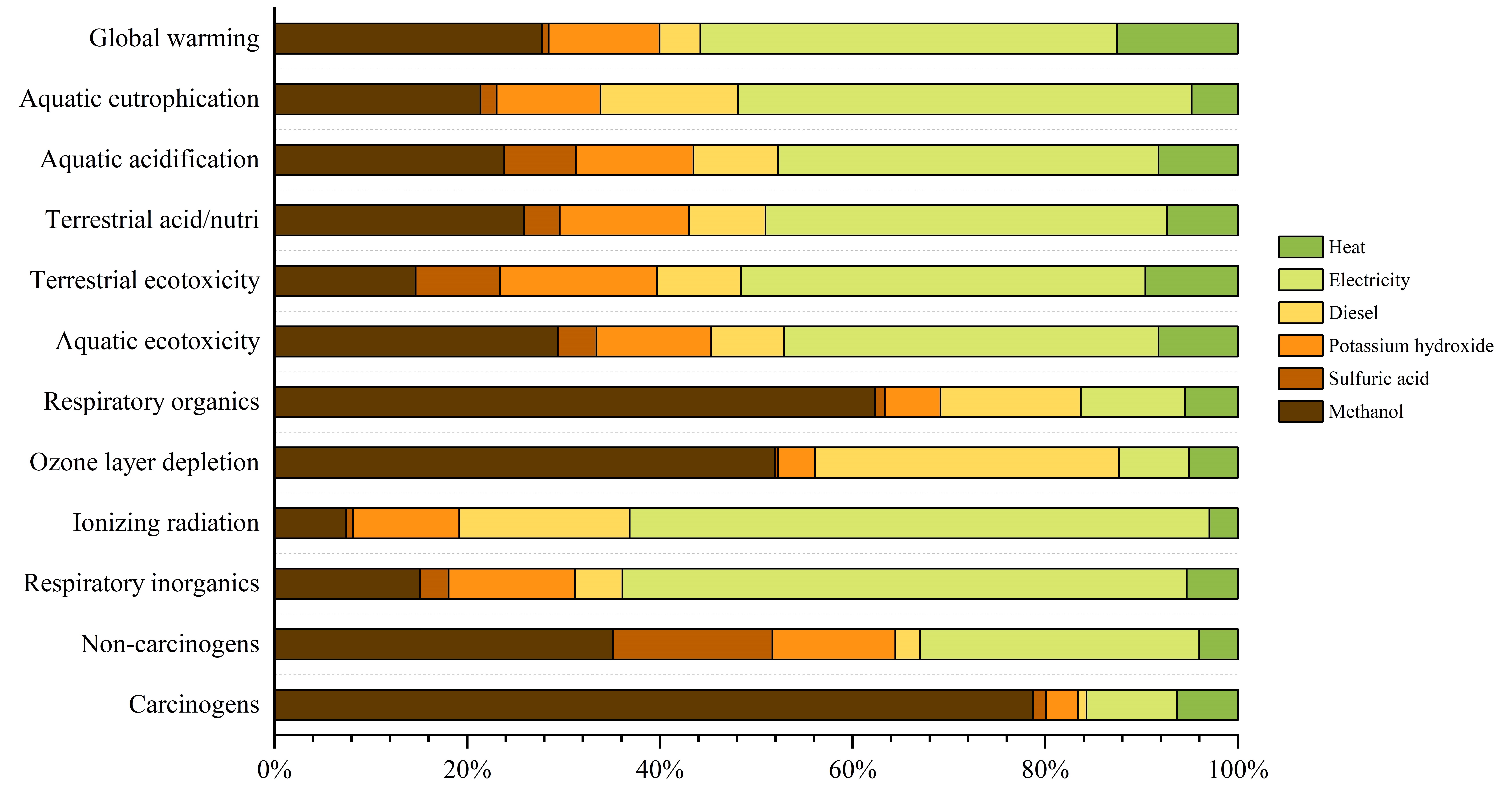 The analysis shows that for UCO biodiesel, electricity use has significant contribution in impact categories of ecotoxicity (40%), acidification (41%), global warming (43%), and eutrophication (47%), whereas methanol use in transesterification has significant contribution in carcinogens (78%) and non-carcinogens (35%), ozone layer depletion (52%), and respiratory organics (62%) impact categories. Using fertilizers during cultivation has high environmental impacts on Palm Oil biodiesel, followed by electricity and methanol.