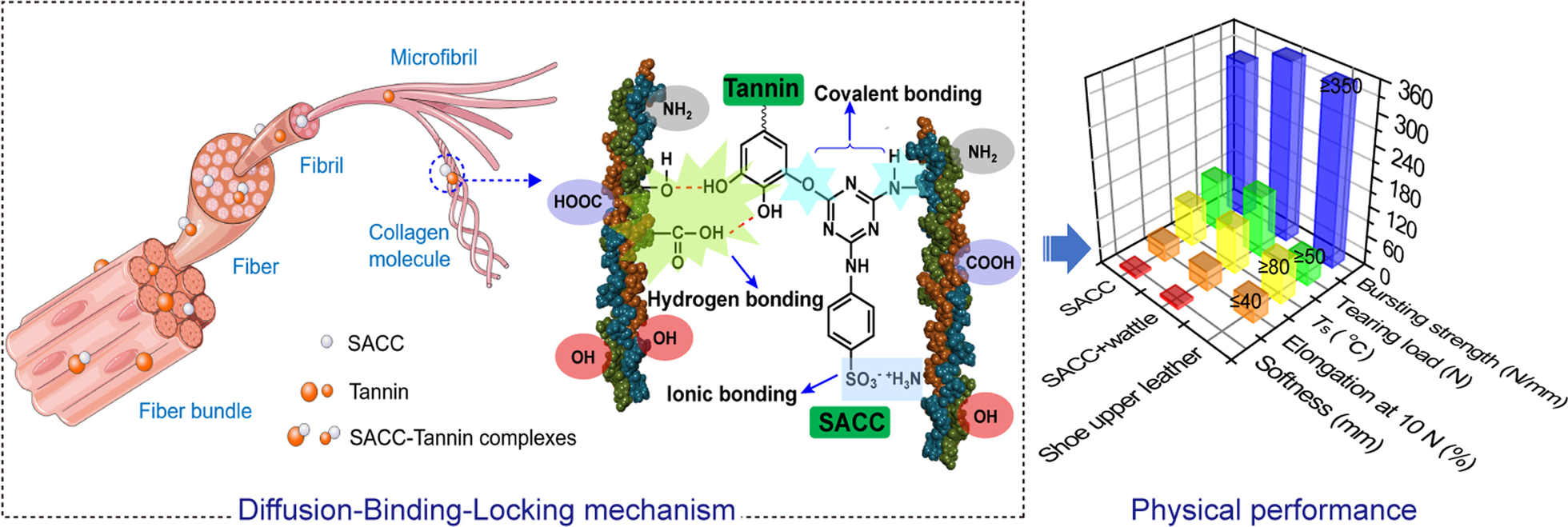The tanning system using environmentally friendly organic tanning agents is considered as an alternative tanning approach. One typical bio-based material is vegetable tannins from plant leaves, fruits, seeds and barks, which have molecular weights of 500–3000 Da and are classified into ester derived hydrolysable tannins (e.g., chestnut) and flavonoid derived condensed tannins (e.g., mimosa). They can penetrate and bind with collagen in multiple levels via hydrogen and hydrophobic bonds to endow the leather with good fullness, human skin compatibility and environmental friendliness. More recently, triazine derivatives as tanning agents for chrome-free leather has attracted immense interest. It mainly reacts with the side-chain amino groups of collagens to form strong covalent bonds, thus enhancing hydrothermal stability of leather. Compared with other organic tanning agents (e.g., aldehydes and syntan), triazine derivatives can effectively mitigate the health risks due to their biocompatibility. Meanwhile, the released H+ in tanning process can simultaneously reduce the tanning liquor pH from ~ 7.8 to ~ 5.0, which facilitates the tanning process (e.g., dispense with pickling) and reduces the discharge of neutral salts. In the previous work, the combination tanning system using tannic acid and triazine derivative (i.e., Granofin® Easy F-90) has been studied to overcome the poor thermal stability and storage stability of solo tanned leather. However, the restricted leather performance of such combination tannages and relatively expensive tannic acid limited their practical application. Moreover, the tanning mechanism underneath this approach lacks clear understanding from molecular level to collagen structure level.