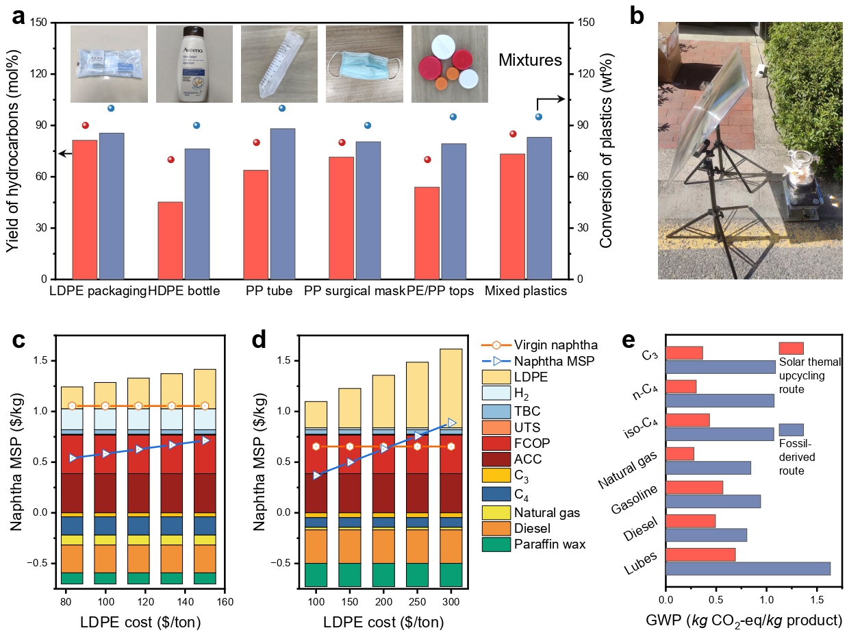 Another surprising fact is that the versatility of our solar thermal system in the upcycling of various real-world polyolefin waste, and the related explorations are inspired by Nature Editor, Dr. Claire Hansell and reviewers in the peer review process (Figure 2). The real-world plastics investigated in our work included the six most common plastics (PET, HDPE, PVC, LDPE, PP, and PS), and combinations thereof. The system demonstrated effective conversions for various post-consumer LDPE, HDPE, and PP, whether individually or in mixed form. The effects of PVC, PS, and PET as impurities on upcycling the mixed polyolefin plastics were also revealed. And we propose a facile and scalable slicing-separation-conversion protocol to separate polyolefins from other heavier-than-water polymers, such as PET, PVC, and PS, via a simple sink-float method in water, achieving a total solution for upcycling of polyolefins from real-world mixed wastes. Besides, based on techno-economic analysis and life cycle assessment of a conceptual upcycling facility, our technology yields economic feasibility in certain regions and 30% reduced greenhouse gas emissions compared with non-renewable fossil-derived processes.