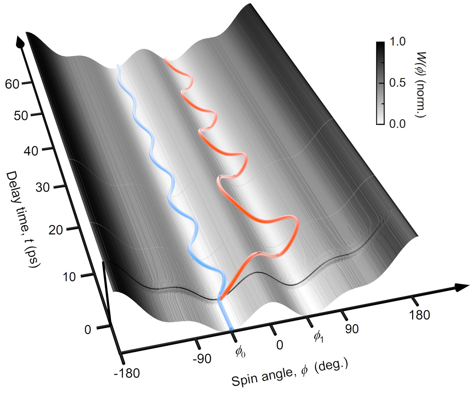 Figure 1 | THz-induced spin switching. Strong-field THz excitation abruptly modifies the magnetic potential, W(𝜙), at t = 0 ps (black solid line), triggering a coherent, large-amplitude spin motion centred around the initial spin orientation angle 𝜙0 (blue trajectory). For THz fields above the switching threshold, the spins traverse the potential barrier at 𝜙 = 0° and reach the adjacent local minimum at 𝜙1 ≈ 𝜙0 + 90° (orange trajectory).