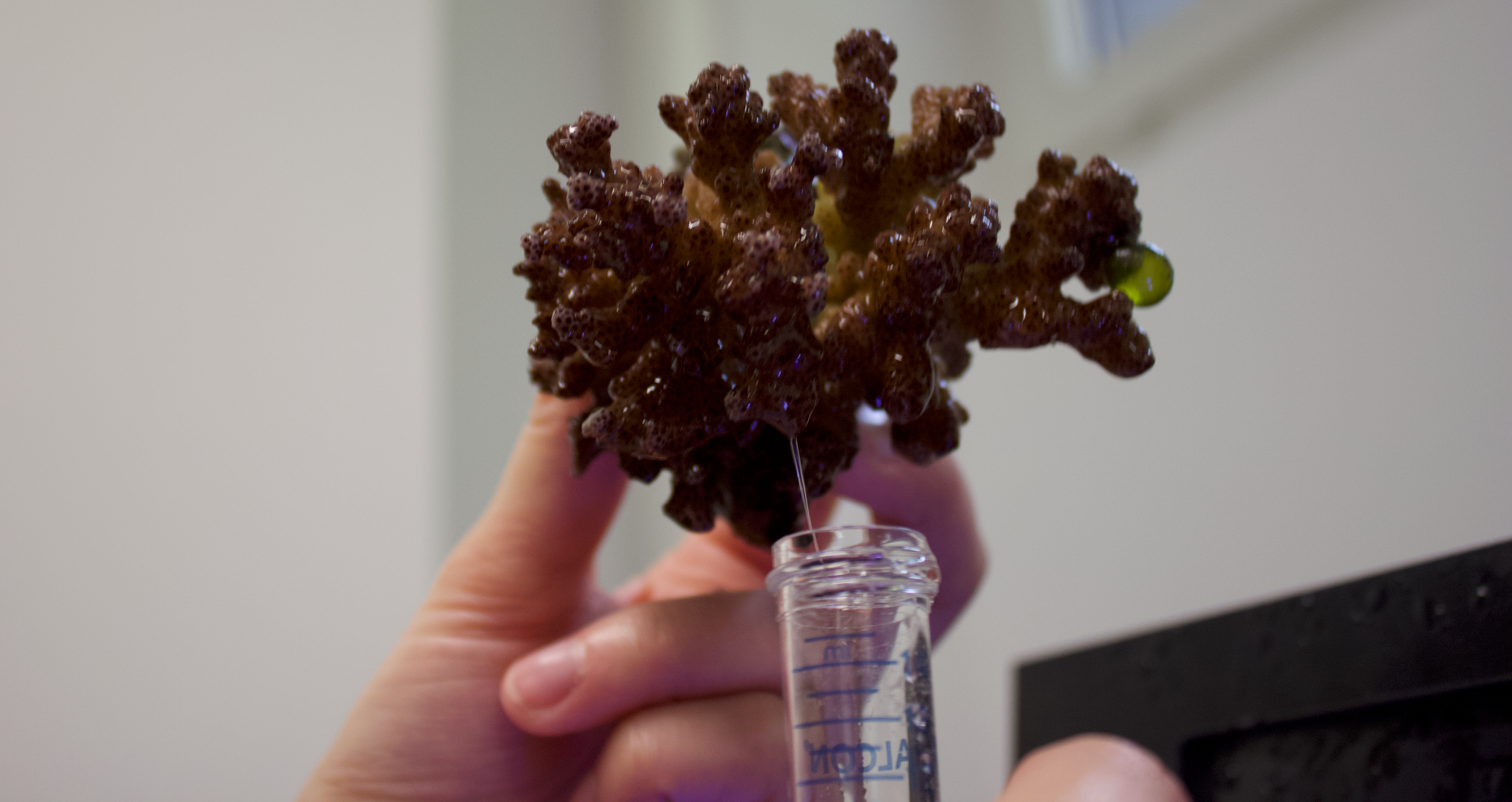 “Coral milking” method of coral mucus collection encourage mucus production through air exposure.