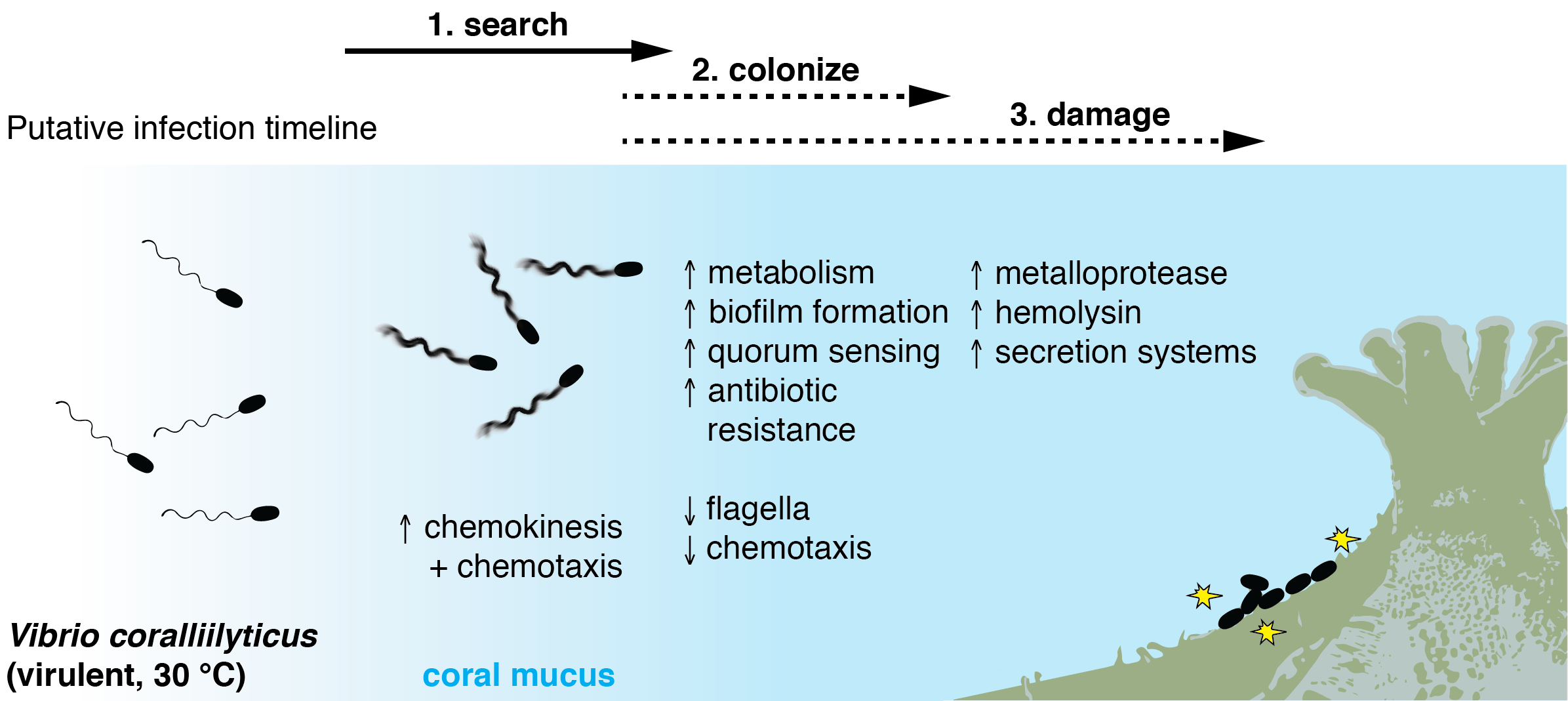 In V. coralliilyticus, these two behaviors (chemotaxis and chemokinesis) combine to enable efficient and rapid targeting of heat-stressed corals [3]. However, chemokinesis, in contrast to chemotaxis, has remained more rarely studied in bacteria and is almost entirely undescribed in the context of marine disease. What is the mechanism and timescale of chemokinesis by V. coralliilyticus in the context of coral infection? What environmental conditions trigger chemokinesis? And what gene expression changes accompany this understudied bacterial behavior?
