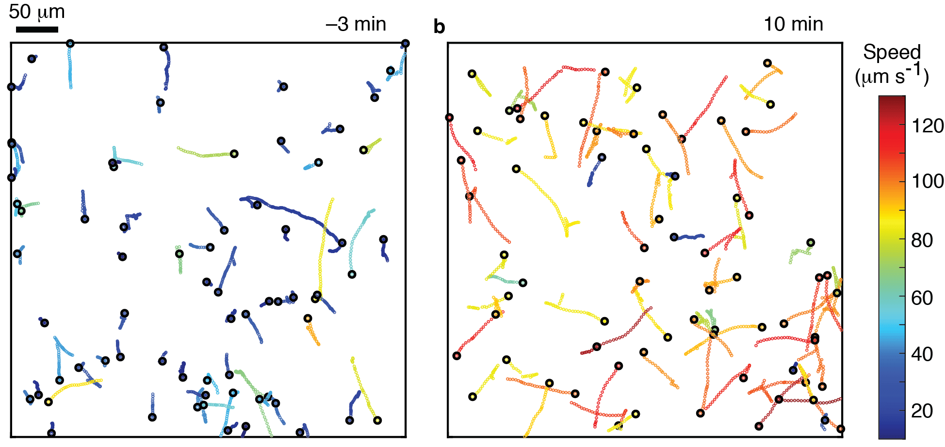 We were astonished by how quickly V. coralliilyticus initiated chemokinesis upon exposure to coral mucus. High-speed and high-resolution video microscopy allowed us to track the behavior of single V. coralliilyticus cells. We analyzed our microscopy videos and quantified individual cell swimming speeds by writing an automated image segmentation and trajectory reconstruction software in MATLAB. Our time-lapse video microscopy revealed that the bacterial pathogens initiate chemokinesis within two minutes upon exposure to coral mucus. They reached a maximum swimming speed of whopping 95.5 ± 4.6 µm/s (2× that of their baseline swimming speeds) within 6 minutes of exposure to coral mucus. The chemokinesis behavior was sustained for over an hour.