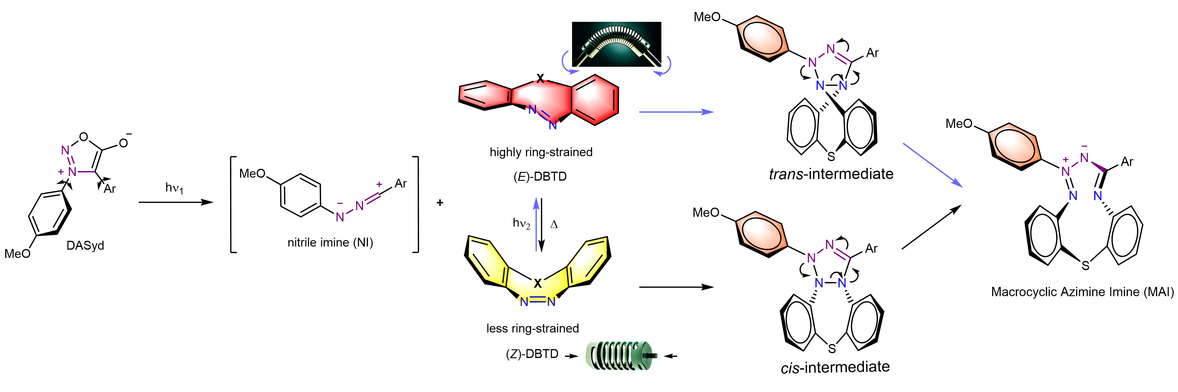 Our first attempt to develop “photo-click” reagent was focused on mesoionic aromatics as dipole source, but the dipolarophile was limited to strained alkene that is widely used in bioorthogonal chemistry. Since 2018, our research team has been trying to fuse photo-switch molecule into the chemical reporter of “photo-click” reaction. Could we find a dipolarophile which would be converted into the “spring-loaded” state in-situ via photo-energy transfer from embedded photo-switch, and eventually promote the desired reaction? We went through a lot of struggles, until gradually realized that ring-strained azobenzene might be a better dipolarophile in term of cycloaddition with nitrile imine dipole. Because this was rarely discovered, we were not convinced until my student obtained the single crystal diffraction data of the adduct, known as Macrocyclic Azimine Imine which surprisingly is also a dipole itself. It is fascinating to see the acceleration of the “photo-click” reaction as DBTD lit up.