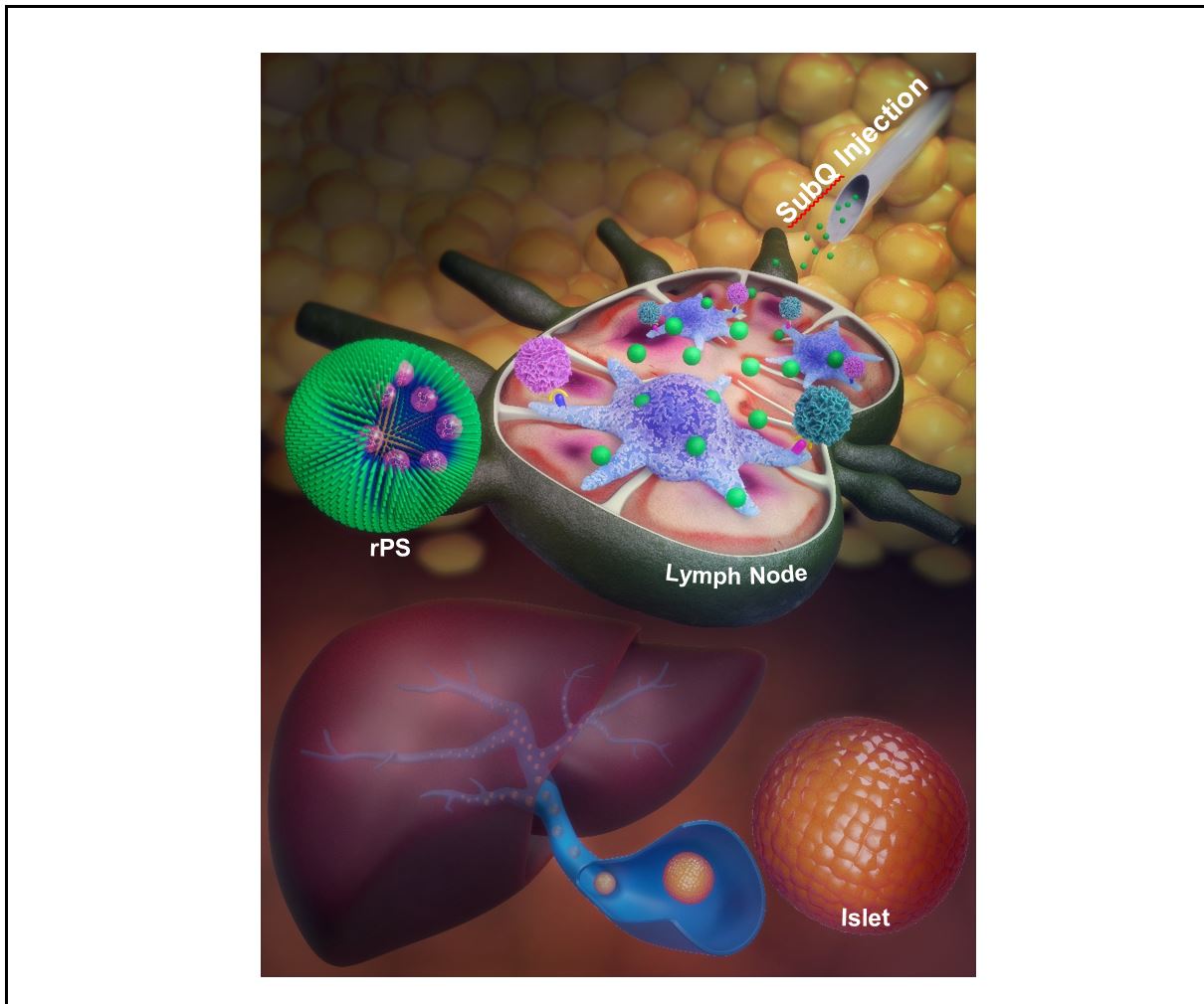 Figure 3 | Subcutaneous injection of rapamycin-loaded polymersomes allows for lymphatic drainage and targeting of antigen presenting cells, which can tolerize T cells to allogeneic islets. Illustration by Alex J. Jerez.