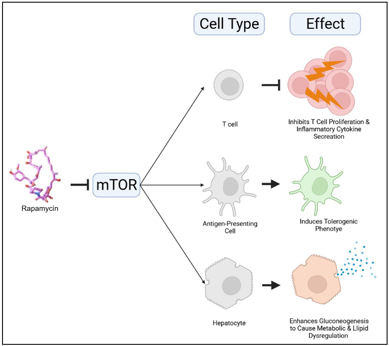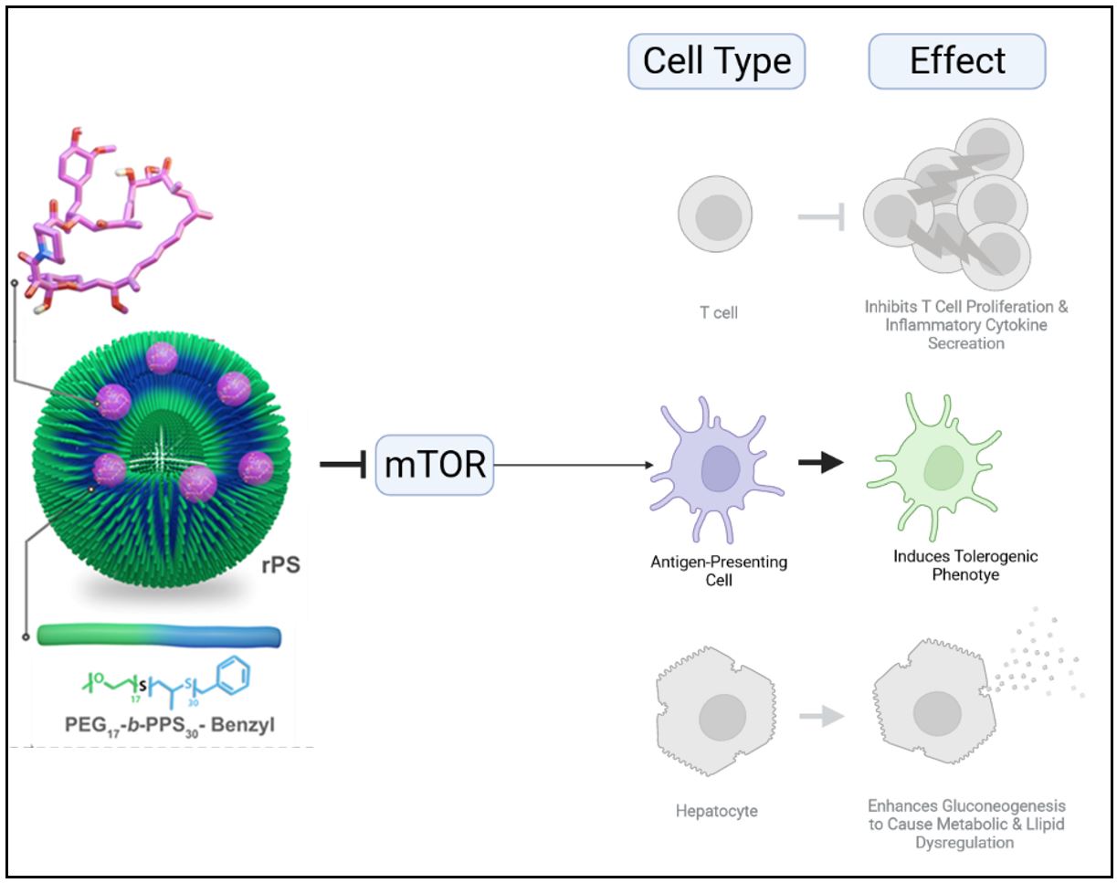 Rapamycin is a maintenance immunosuppressive drug, prescribed for a variety of transplantation procedures. Rapamycin functions by inhibiting the mTOR pathway. While mTOR regulates T cell proliferation, it has many other functions depending on the cell type. For example, inhibiting mTOR in hepatocytes causes an upregulation of gluconeogenesis. This causes glucose to be readily released from these cells, resulting in metabolic and lipid dysregulation. We aimed to deliver rapamycin in a way that would prevent delivery to off-target cells and thus reduce such side effects (Fig. 1).