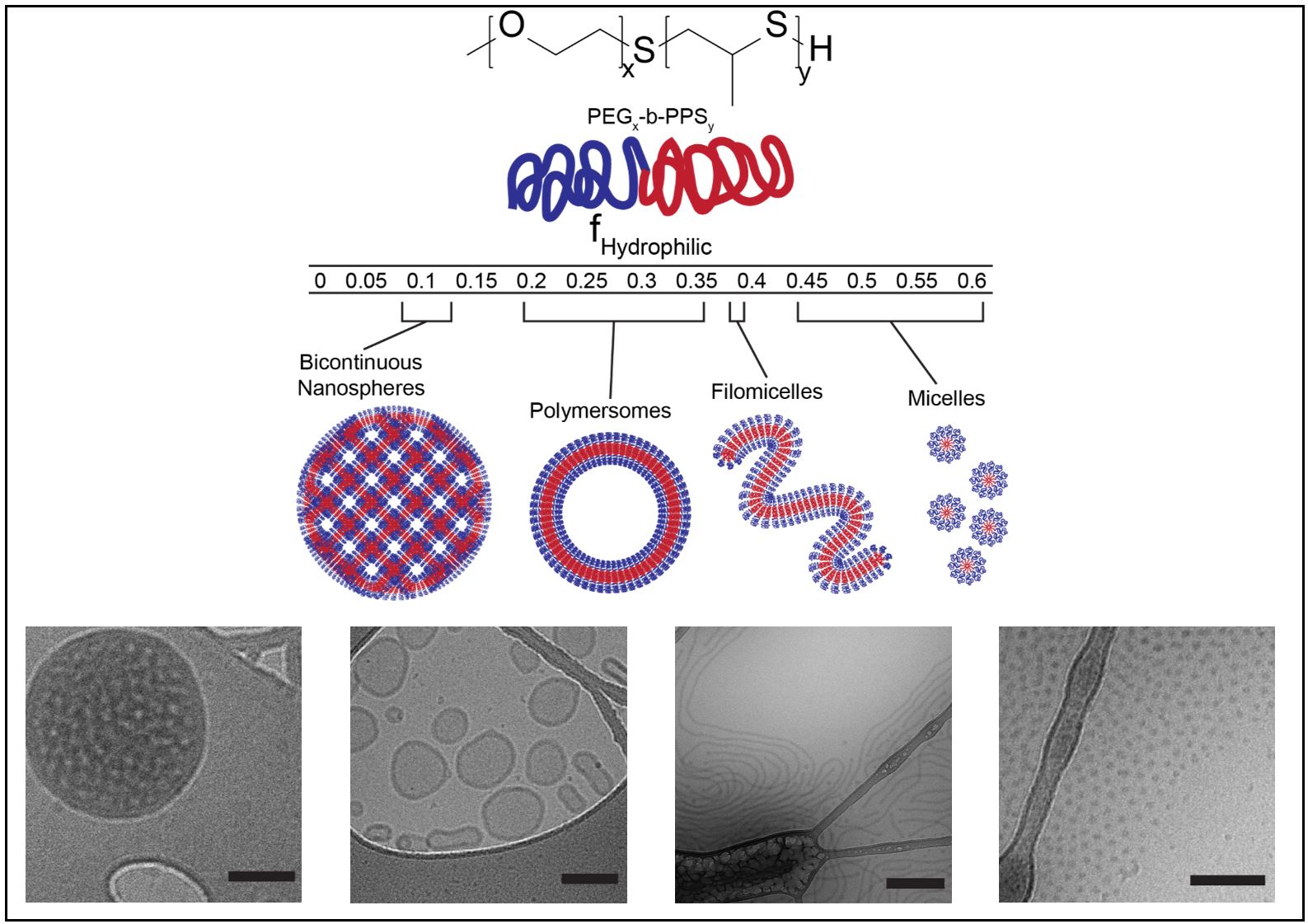 Figure 2 | Poly(ethylene glycol)-b-poly(propylene sulfide) copolymers self-assemble into a variety of nanostructures, each with unique properties. Top: Chemical structure of poly(ethylene glycol)-b-poly(propylene sulfide) (PEG-b-PPS) copolymers. Middle: Schematic showing how the assembled nanostructure can be specified by varying the length of the hydrophilic PEG fraction of the copolymer. Bottom: Cryogenic transmission electron (cryoTEM) images of nanostructures. From left to right: bicontinuous nanospheres, polymersomes, filomicelles, micelles.