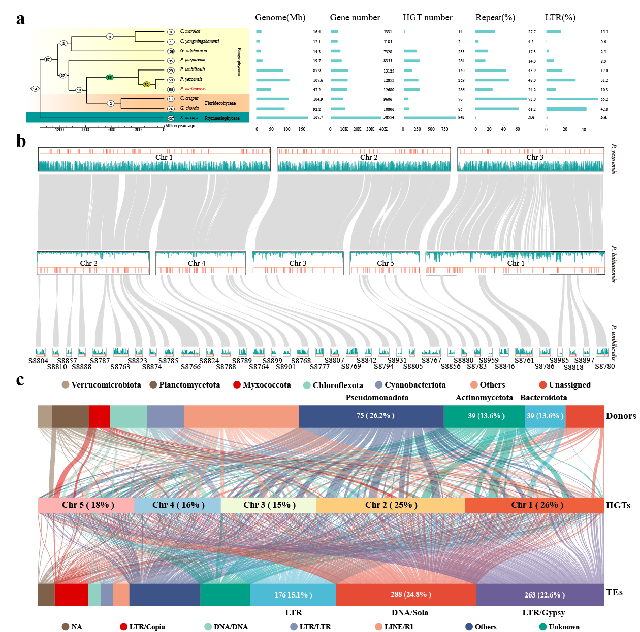 Fig. 1. Comparative analysis of horizontal gene transfer (HGT). a) Phylogenetic tree presenting the relationships among ten algal species. b) Genomic collinearity demonstrated by the comparison of P. yezoensis, P. haitanensis, and P. umbilicalis. c) Sankey diagram illustrating the flow of HGT genes from donor species to TE classes in P. haitanensis.