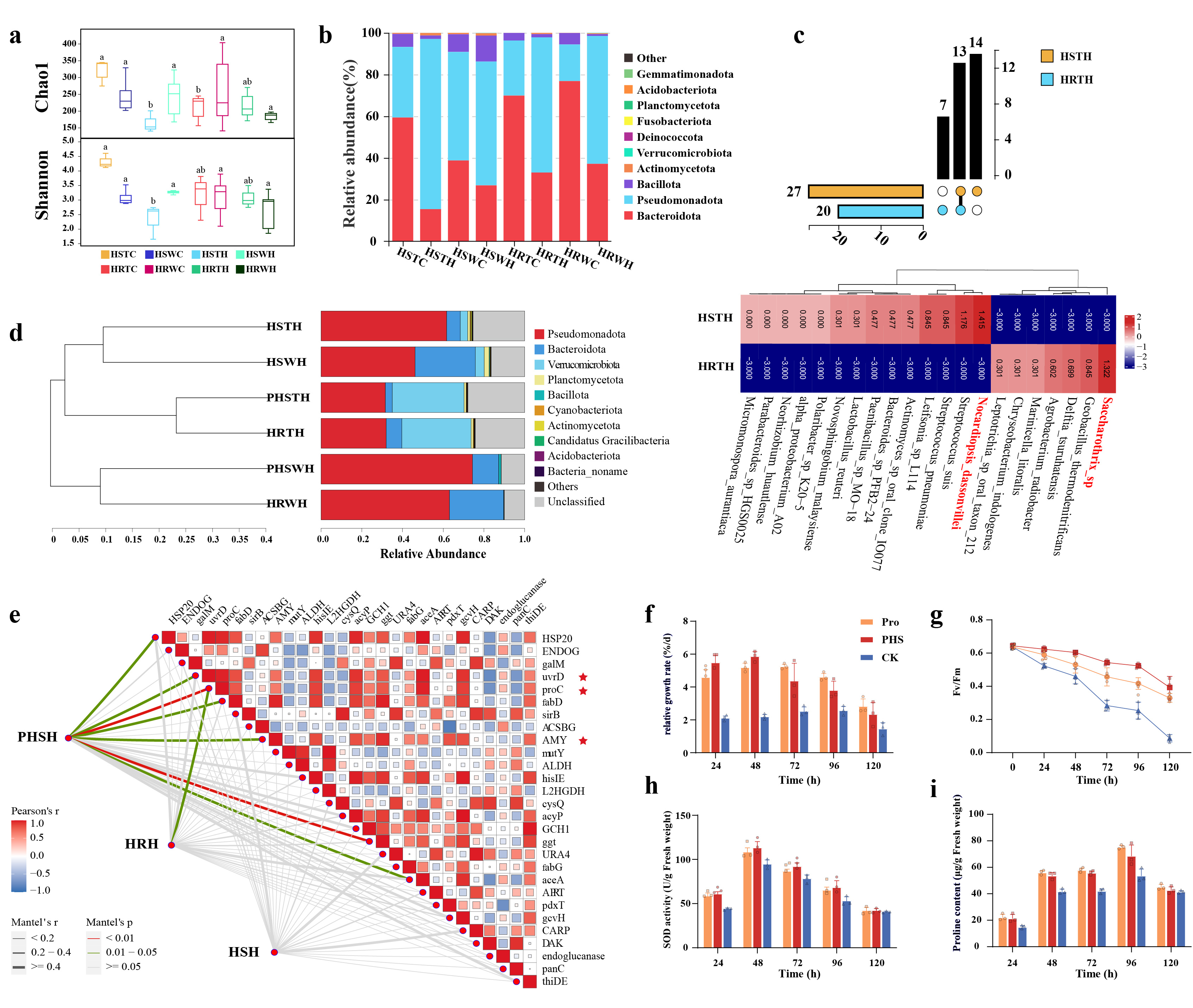 Fig. 2. Screening, isolation, and regulation of key HGT donor bacteria in P. haitanensis and verification of their ability to enhance the thermal tolerance of thalli. a) Changes in the Chao1 and Shannon indices in water and thallus samples the from the HS strain and HR strain under high-temperature conditions. T and W represent thallus and water samples, respectively, whereas C and H represent normal- and high-temperature treatments, respectively. b) Relative abundance of the community composition (phylum) in the algal intermicrobial environment. c) Venn diagram and heatmap illustrating the differences in the number and abundance of shared and unique bacteria between the thallus samples of the HS strain and HR strain. d) Analysis of the composition of the macrogenomic community (phylum) and sample clusters. P represents the addition of Saccharothrix sp. e) Analysis of the correlation between different treatments of intermicrobial microorganisms and HGT homologous genes. 6. fi) Effects of the addition of proline (Pro) and Saccharothrix sp. (PHS) on the physiological and biochemical indices of the HS strain (CK) thallus under high-temperature conditions. Measurements include (f) Relative growth rate, (g) maximum quantum yield (Fv/Fm), (h) superoxide dismutase (SOD) activity, and (i) free proline content.