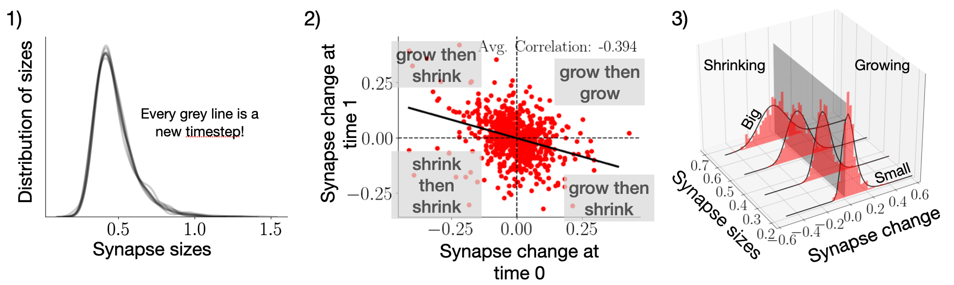 If the synapse was big initially, it would be more likely to shrink in the next time frame, and vice versa; if it was small, it was more likely to grow.