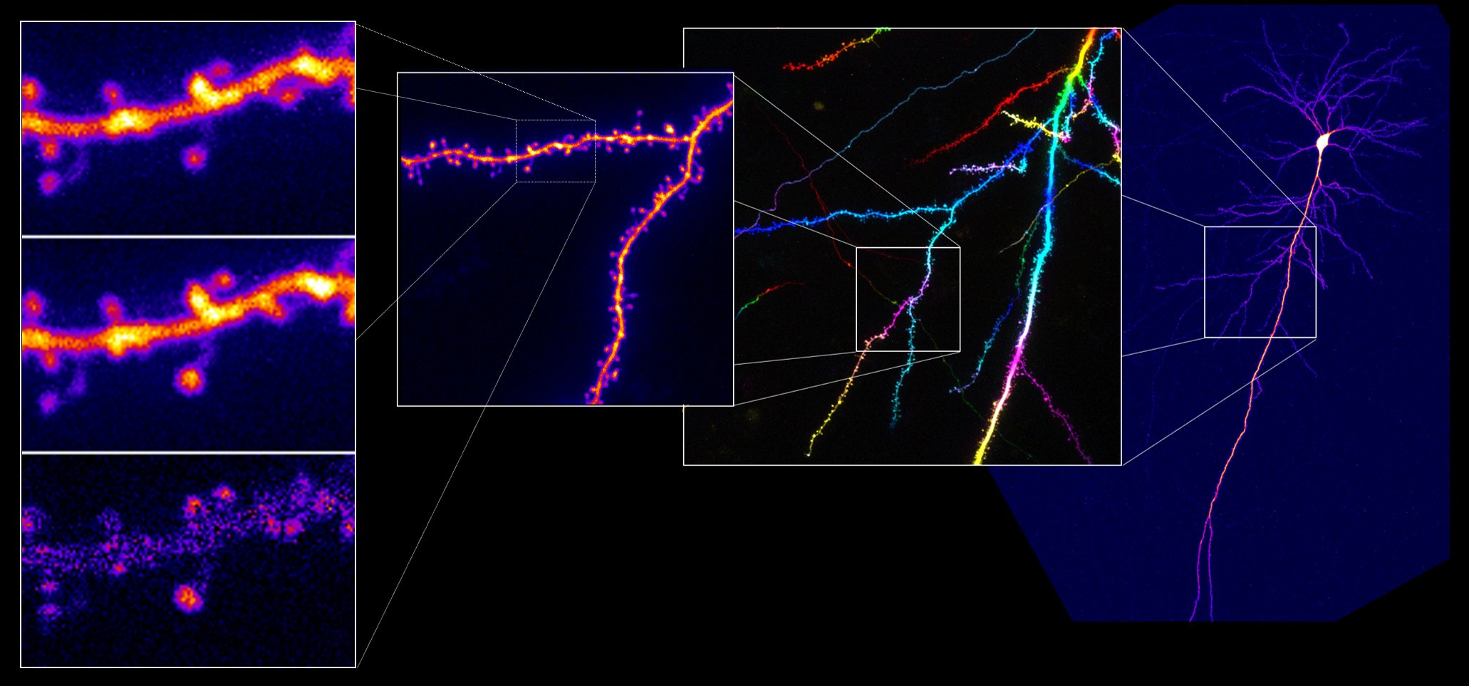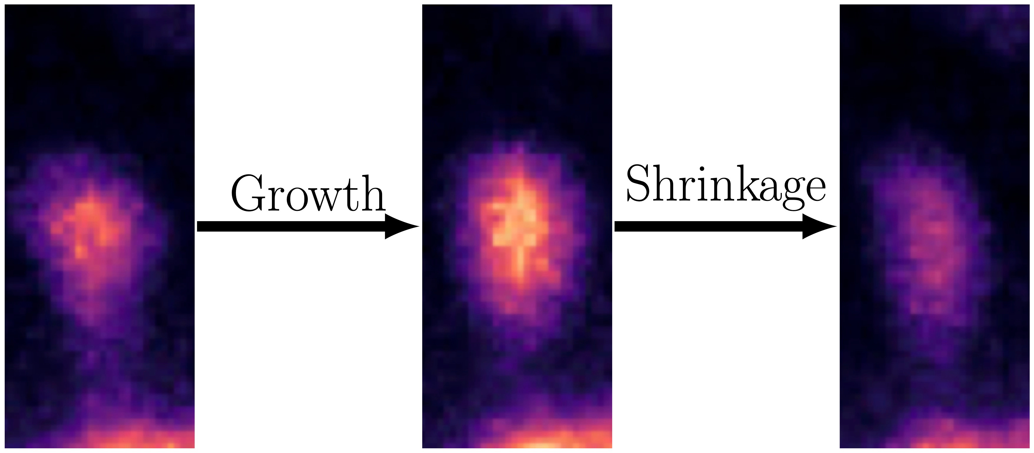 In our paper, "Linking spontaneous and stimulated spine dynamics,"2 we studied this synaptic turnover and its properties. Synapses are the microscopic "communication bridges" in your brain, where neurons exchange electrical and chemical signals to transmit information, enabling everything from thought and memory to movement and emotion. An example of how the postsynaptic side of a synapse (also known as a spine) looks like on a neuron can be seen in the zoomed-in picture below.