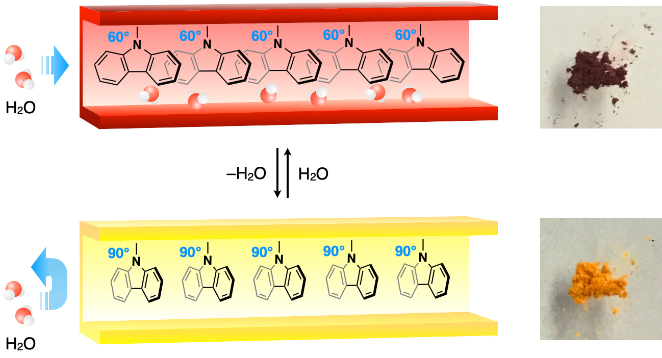 Here, we report a functionalized microporous crystal that are sustained via van der Waals (VDW) forces.1 Upon solvent-assisted thermal annealing, a newly synthesized donor-acceptor type dendritic molecule assembles to form a porous crystal. Although attractive force between the constituent dendrimers are very weak, the crystal maintains its structural integrity even after the complete drying of the solvent molecules. The vacant space, emerged by the desolvation, can trap gaseous molecules. Concomitantly, the porous crystals change its colour typically from yellow to red due to the dipole-dipole interaction with the adsorbed molecules. In particular, the colour change is drastic when the porous crystal is exposed to water moisture. The colour change occurs abruptly when the relative humidity exceeds a certain threshold (40–50 %RH at ambient temperature), at which the surface of the pore alters from hydrophobic to hydrophilic. Detailed spectroscopic investigations and computer simulations reveal that the outermost dendrons are mobile in the crystals and rotate synchronously at the threshold humidity. Although the predictable synthetic methodologies for VDW crystals has not yet been established, we are sure that such weak bonding nature of VDW porous crystals possess distinct virtues in processing or stimuli responsivity.