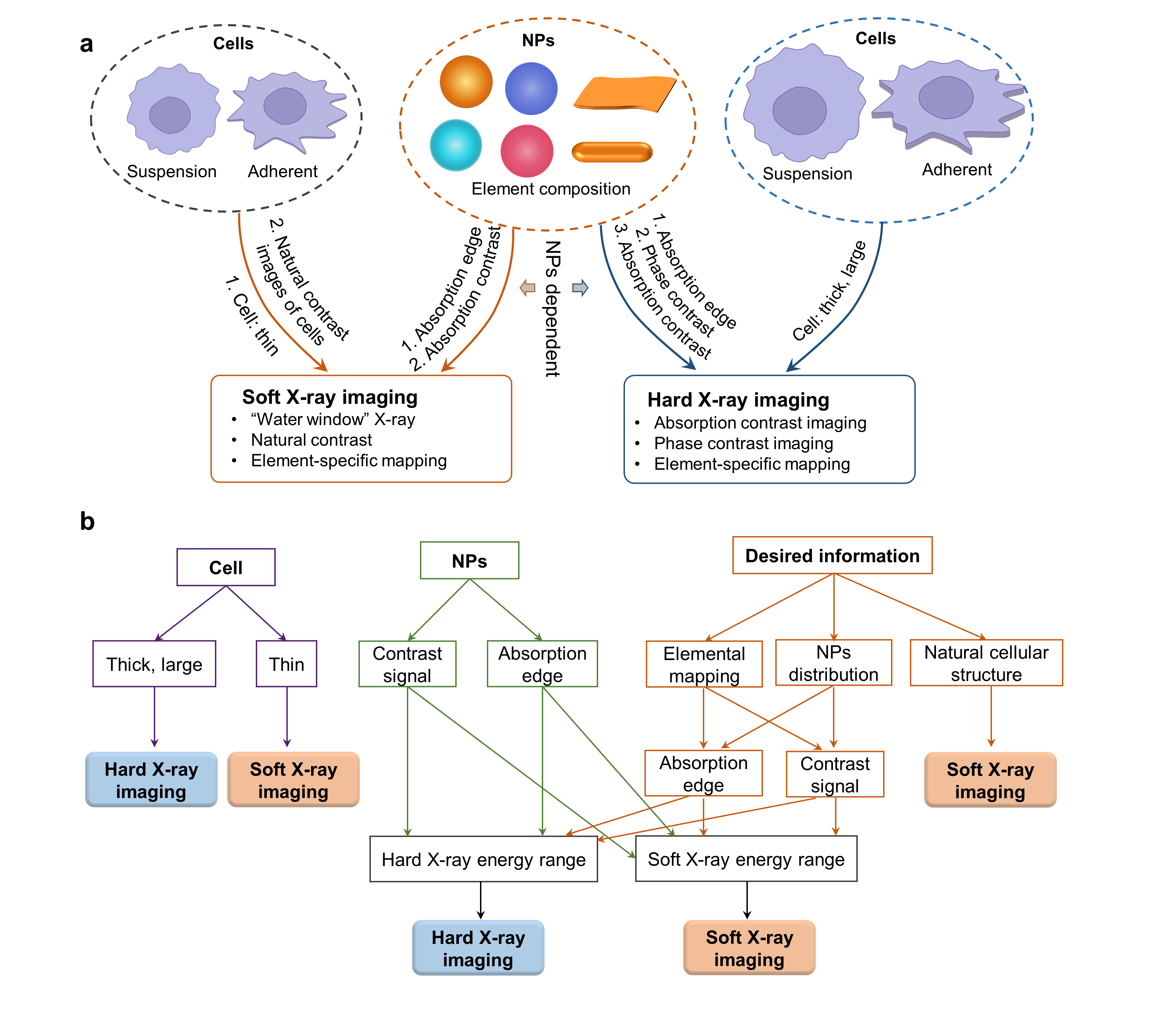 Beamline selection: Cell types and NPs’ compositions are key factors determining the options from soft and hard X-ray imaging beamlines (Fig. 2). If the cell is thin (< 10 mm), or 2) element-specific information of intracellular NPs is preferred and the absorption edge of the element of NPs is in the soft X-ray energy range, or 3) NPs have high absorption contrast at soft X-ray energy which can be distinguished from cellular compositions, or 4) the natural cellular structure is the desired information, soft X-ray imaging is suitable. Hard X-ray imaging is the preferable choice if 1) the cell is large and thick, or 2) the absorption edge of the element is in the hard X-ray energy region, or 3) NPs have distinct absorption/phase contrast at hard X-ray range.